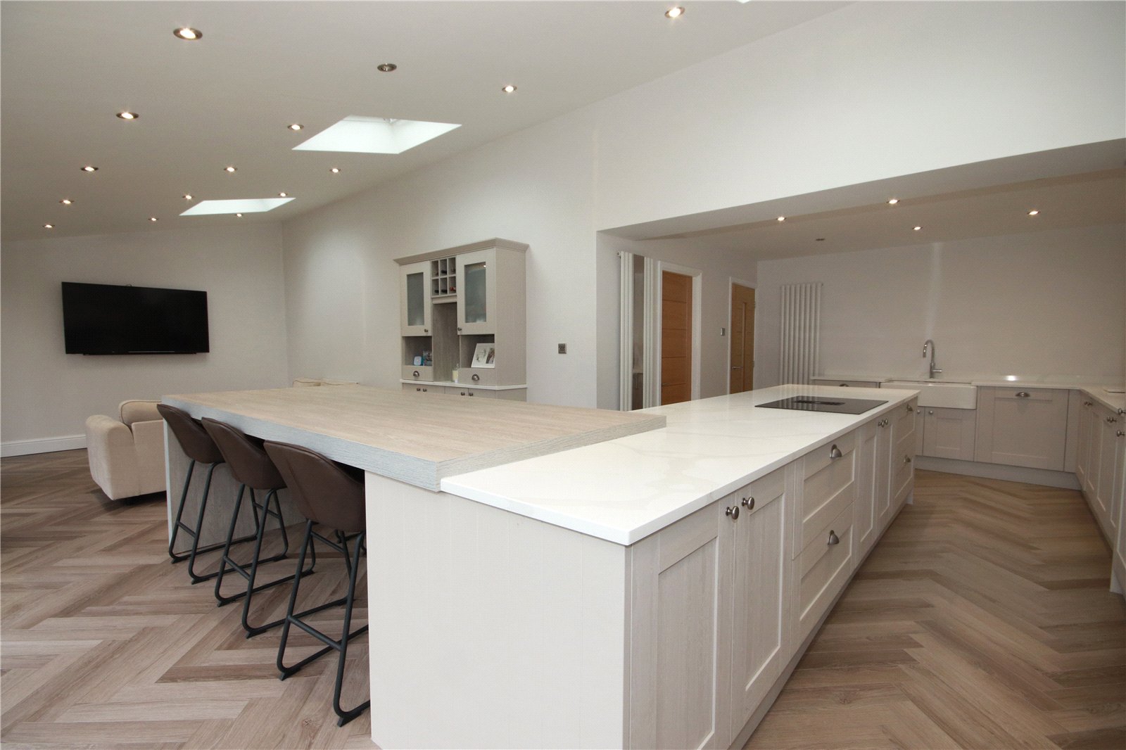 The welcoming entrance hall provides access to a versatile study or reception room to the left, ideal for home working or a snug, while to the right is a well-proportioned living room offering a comfortable space for relaxation. The hallway also leads to a convenient downstairs WC and opens through to the impressive, newly extended open-plan kitchen and living area to the rear of the property. This light-filled space forms the heart of the home, perfect for modern family living and entertaining, with views over the rear garden. A doorway from the kitchen leads through to a practical utility room, offering additional storage and workspace.