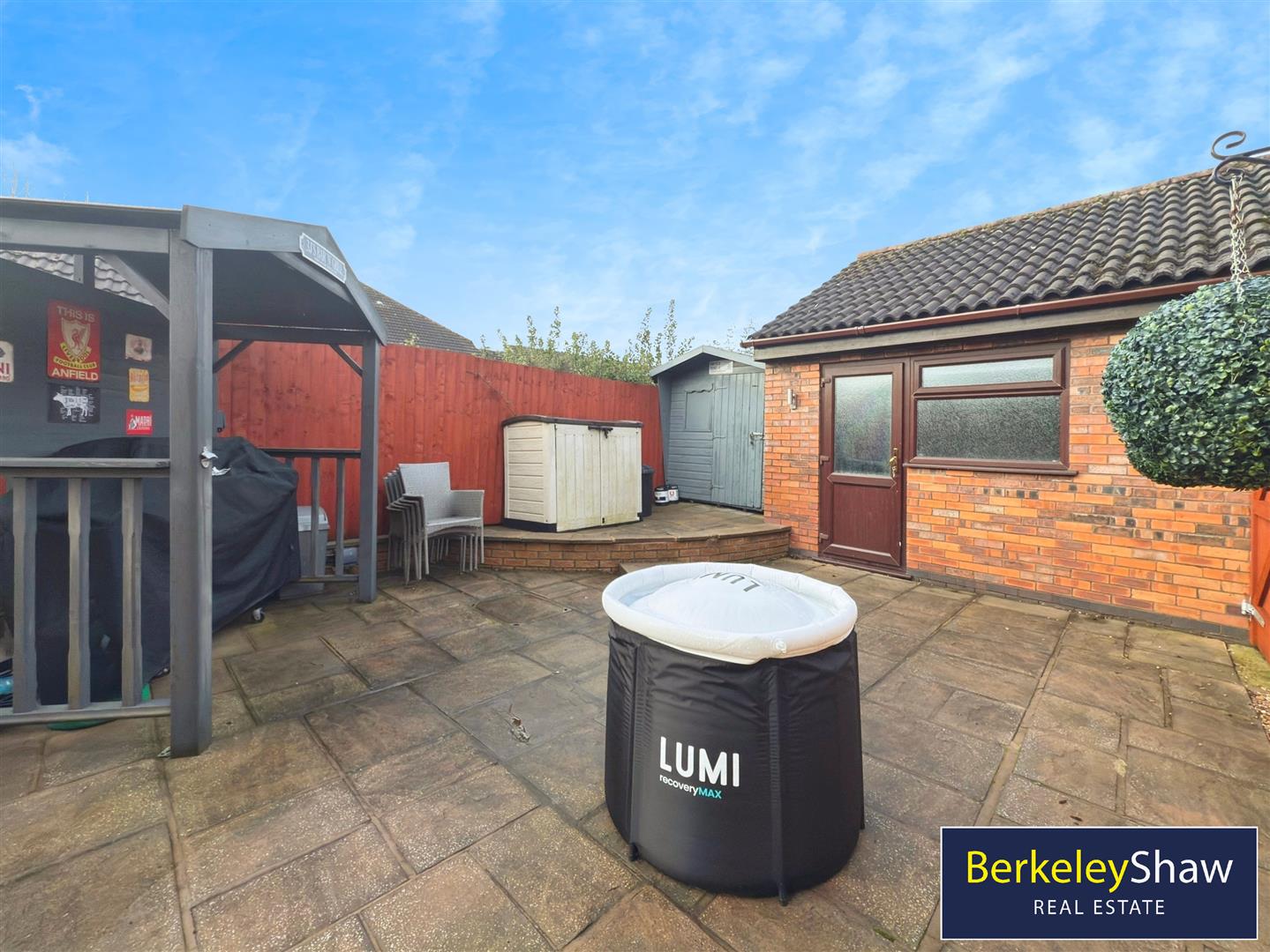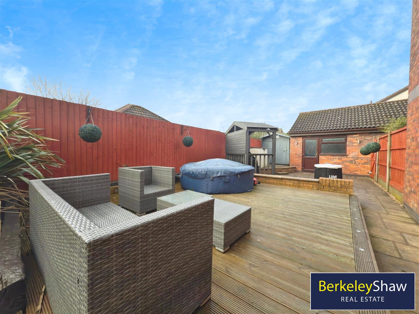The property occupies a pleasant plot with a wrap-around garden, featuring a well-maintained lawn and a sunny decked patio area, ideal for outdoor dining and entertaining. A driveway provides off-road parking for one vehicle. A particular highlight is the detached converted garage, which is fully serviced and currently utilised as a home office, with the added benefit of being used as a bar during the summer months, offering flexible and versatile space.