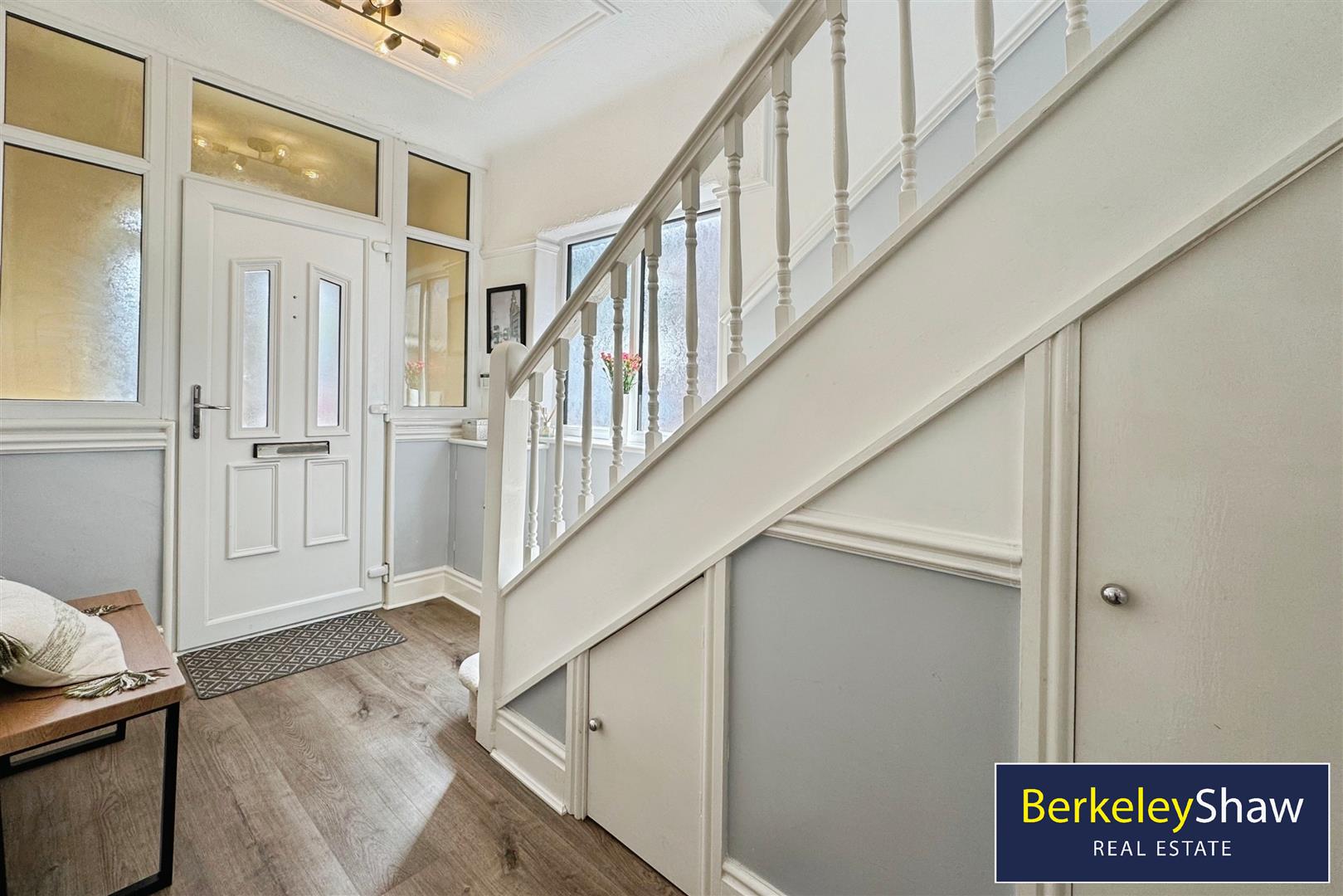 Hallway - A welcoming entrance features a porch leading into a hallway with laminate wood flooring and a window allowing natural light. The staircase ascends to the first floor, and there is access to the living and dining rooms as well as a useful storage cupboard beneath the stairs.