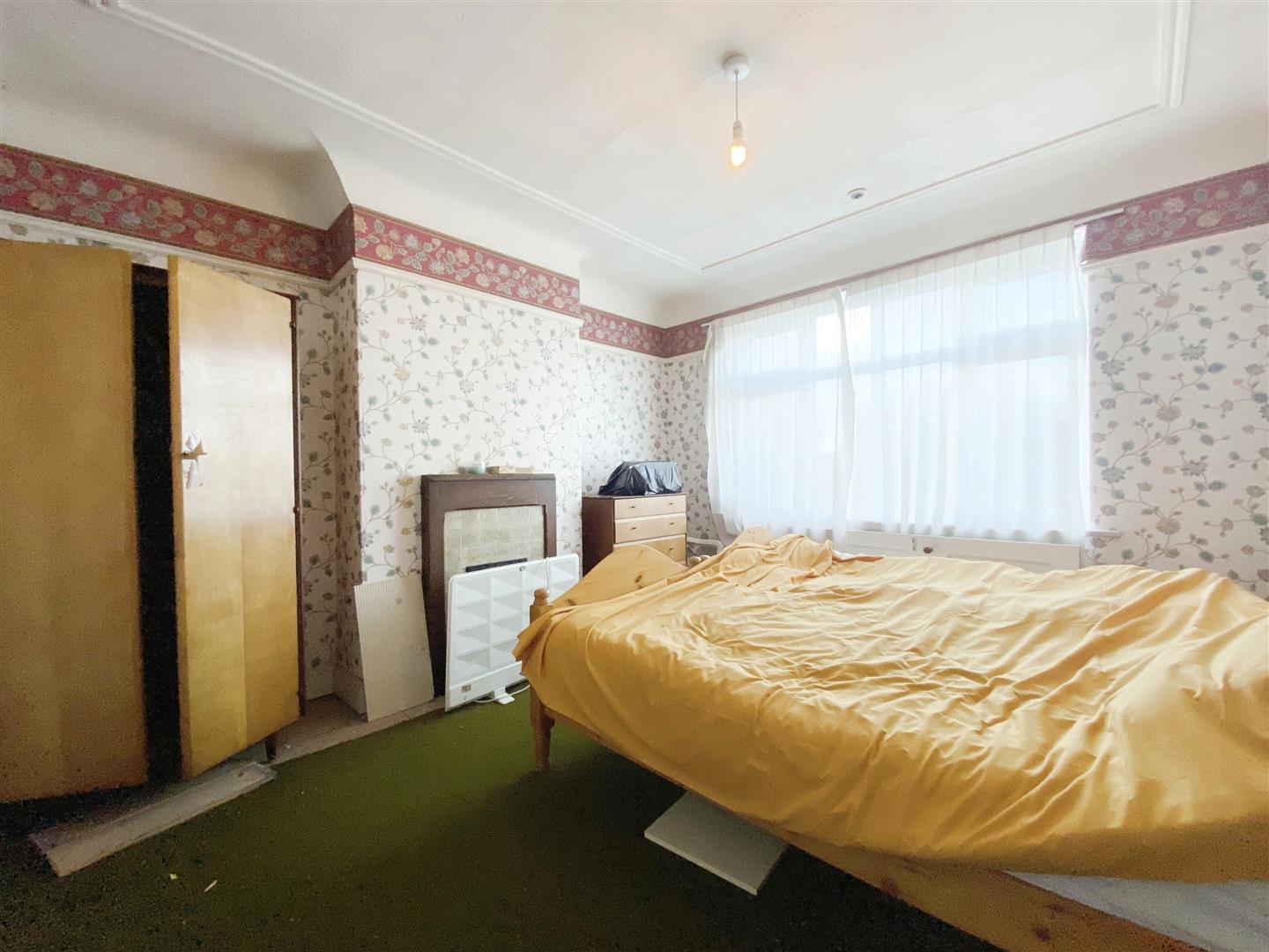 Bedroom 1 - Feature fireplace, radiator, double glazed window & picture rail.