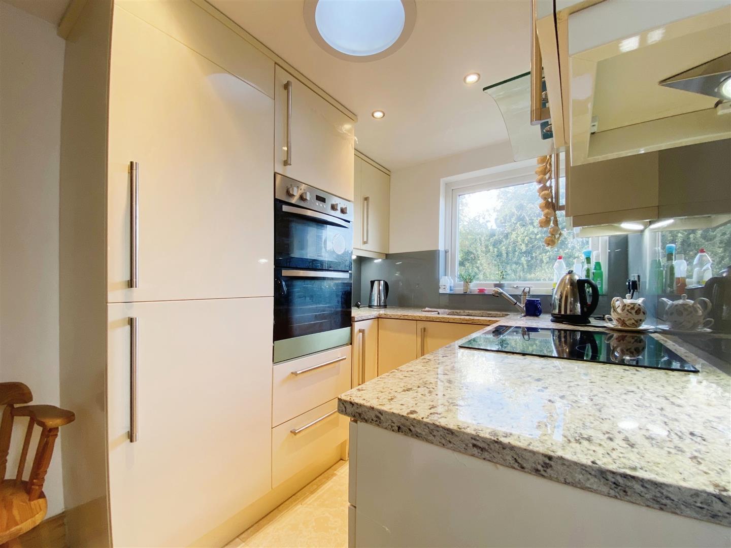 Kitchen - Range of wall & base units, quartz work tops, induction hob, double electric oven, integrated fridge freezer, integrated washing machine, extractor hood, spotlights, sink unit, double glazed window and UPVC door to garden.