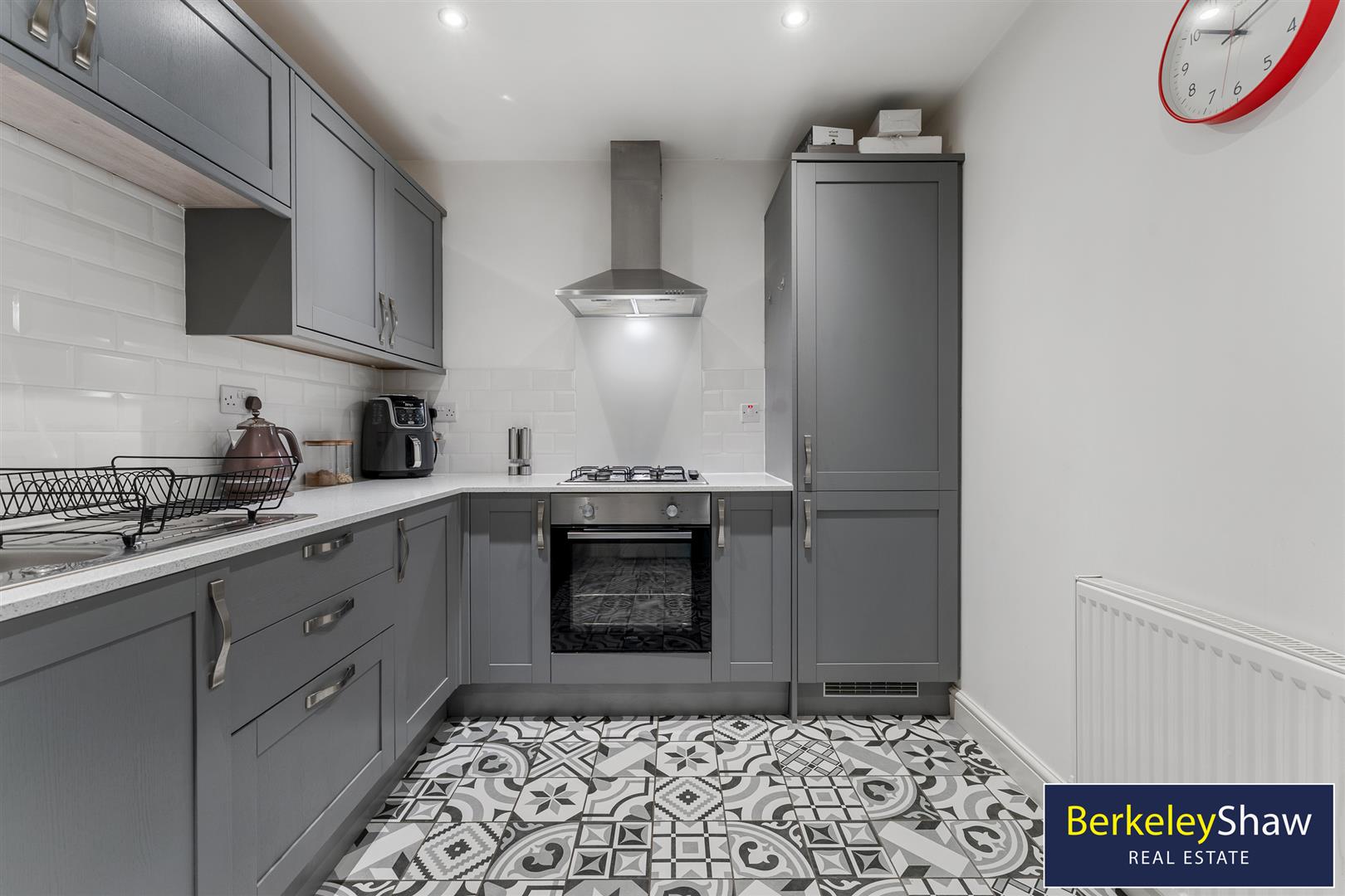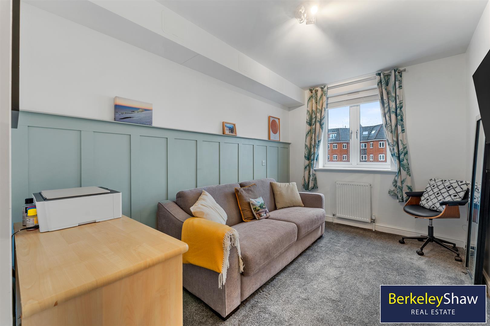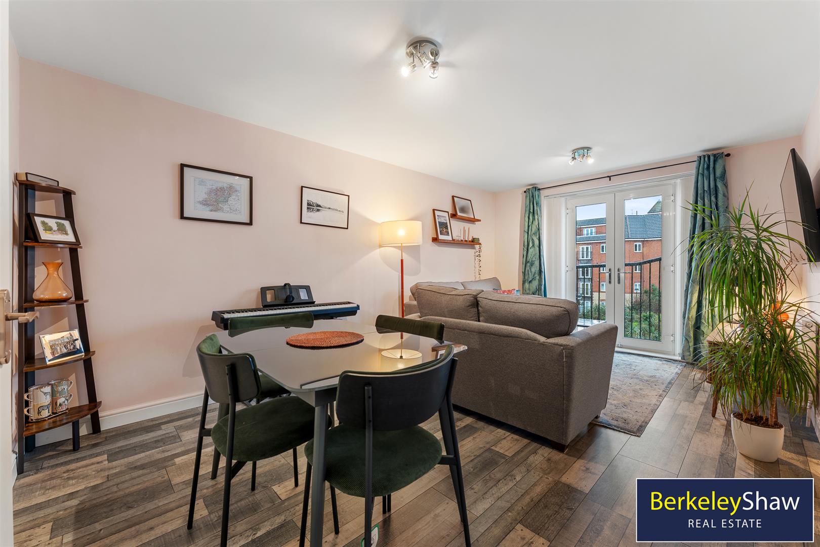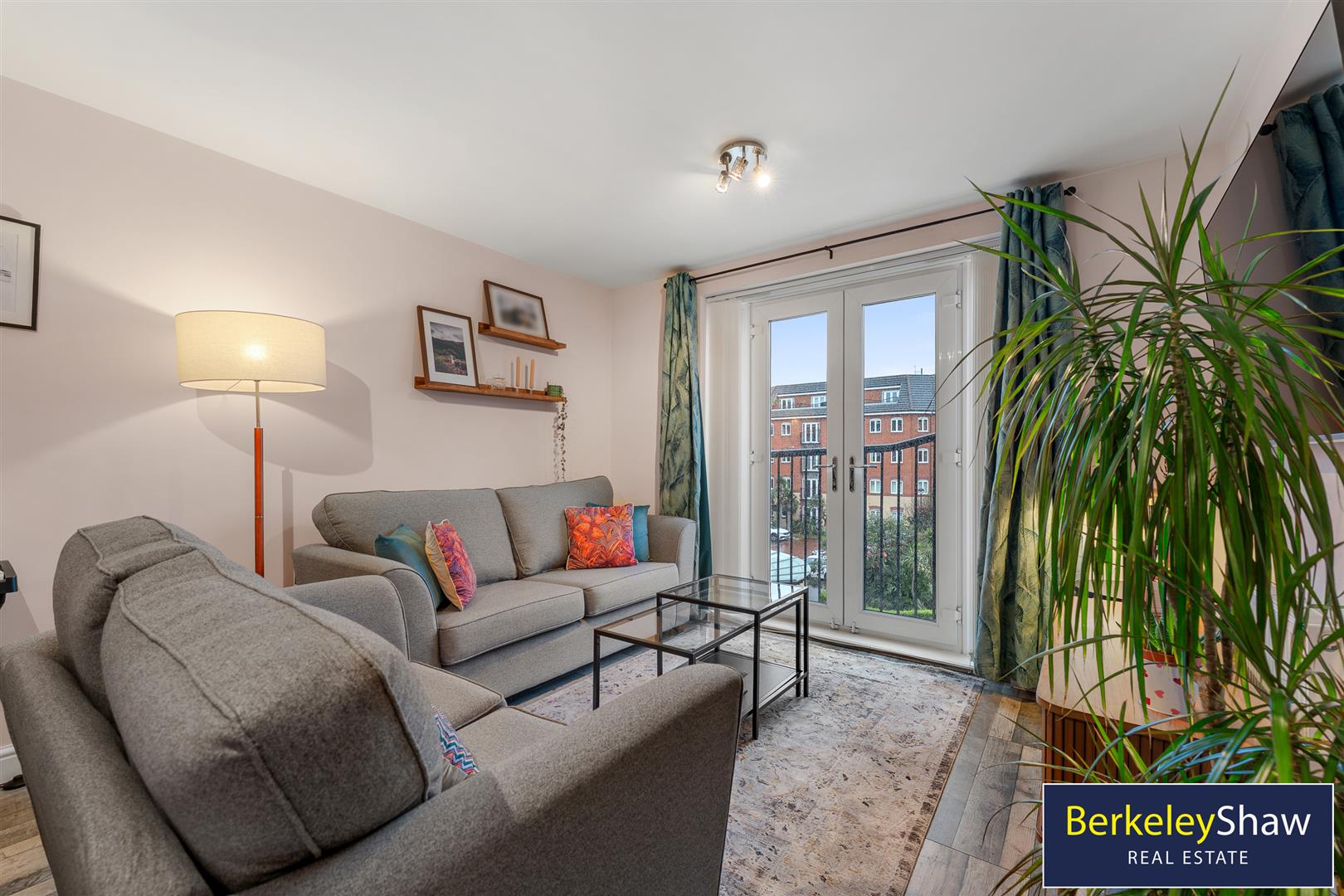 At the heart of the home is a bright and airy open-plan living and dining area, beautifully illuminated by French doors that open to a charming Juliette balcony-perfect for enjoying fresh air and a glimpse of the waterfront setting. The contemporary kitchen is finished to a high standard and offers a range of integrated appliances, making it both practical and stylish.