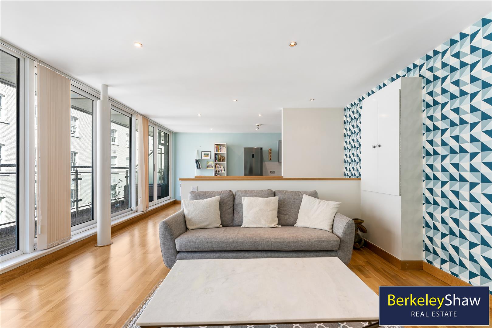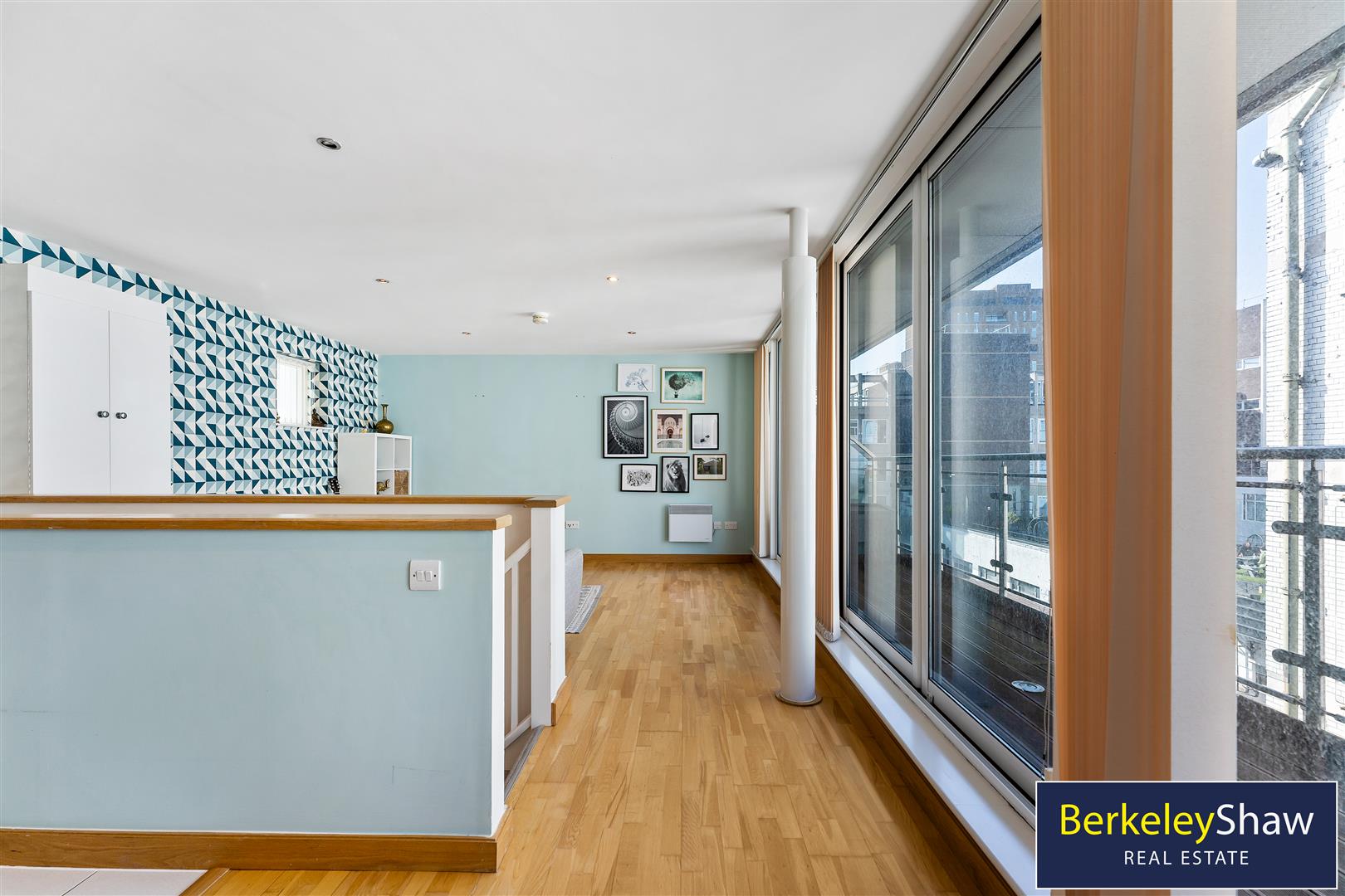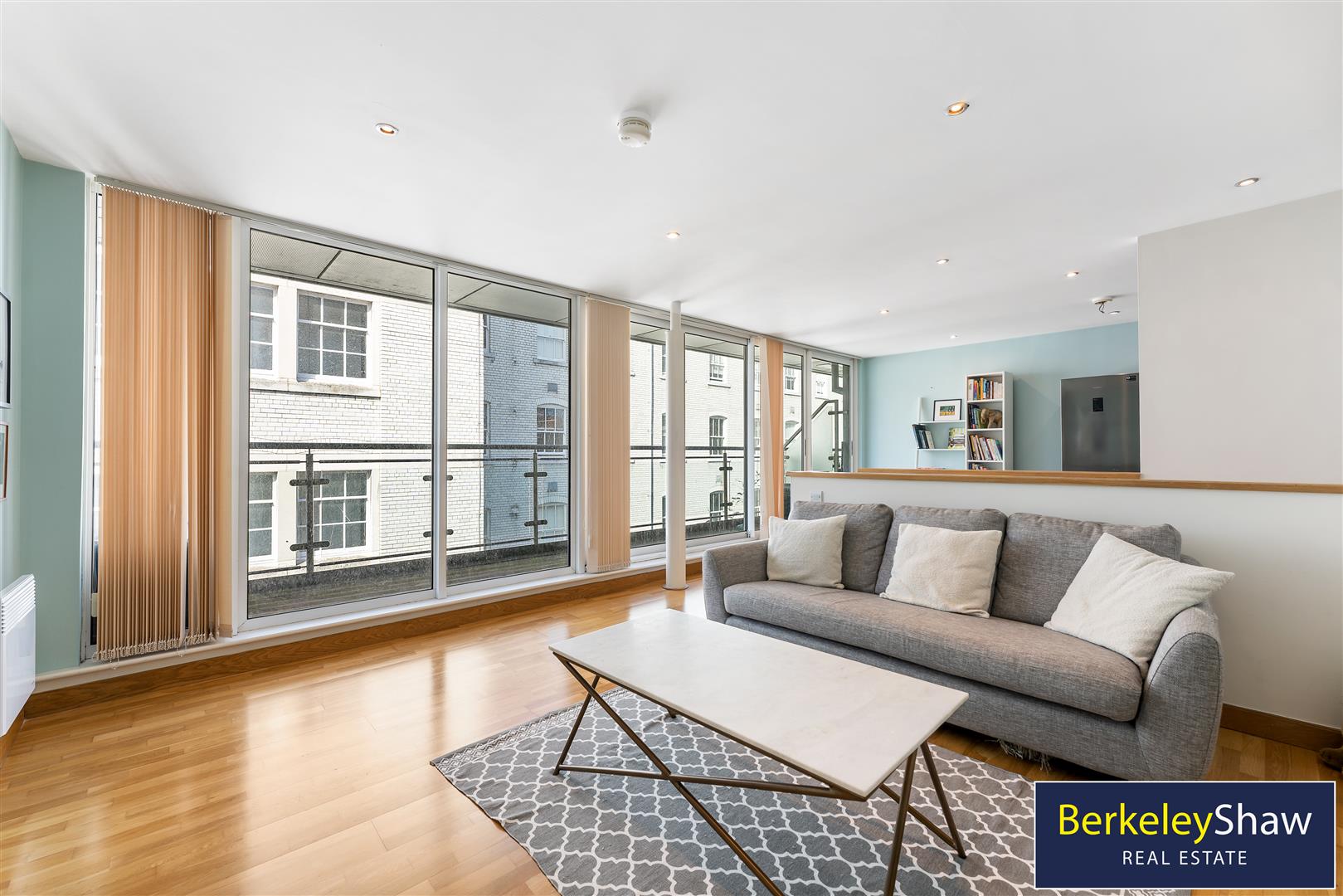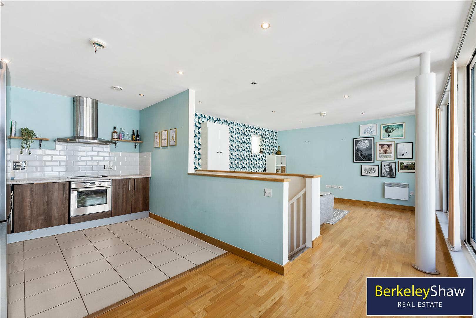 Upstairs, the property opens into a spectacular open-plan living and kitchen space, where impressive floor-to-ceiling windows flood the room with natural light and create a bright, contemporary living environment. Sliding doors lead directly onto a substantial balcony, offering a fantastic outdoor space rarely found in city centre apartments. The modern, sleek kitchen is thoughtfully designed and features integrated appliances including an oven, hob and dishwasher.