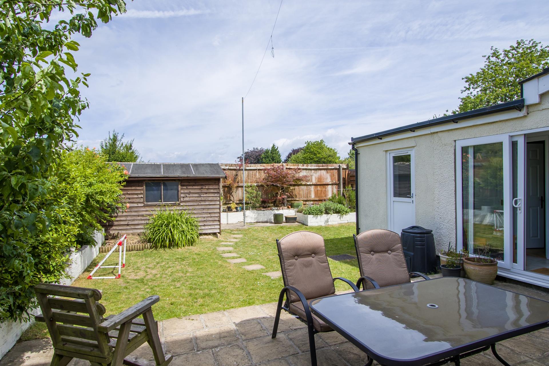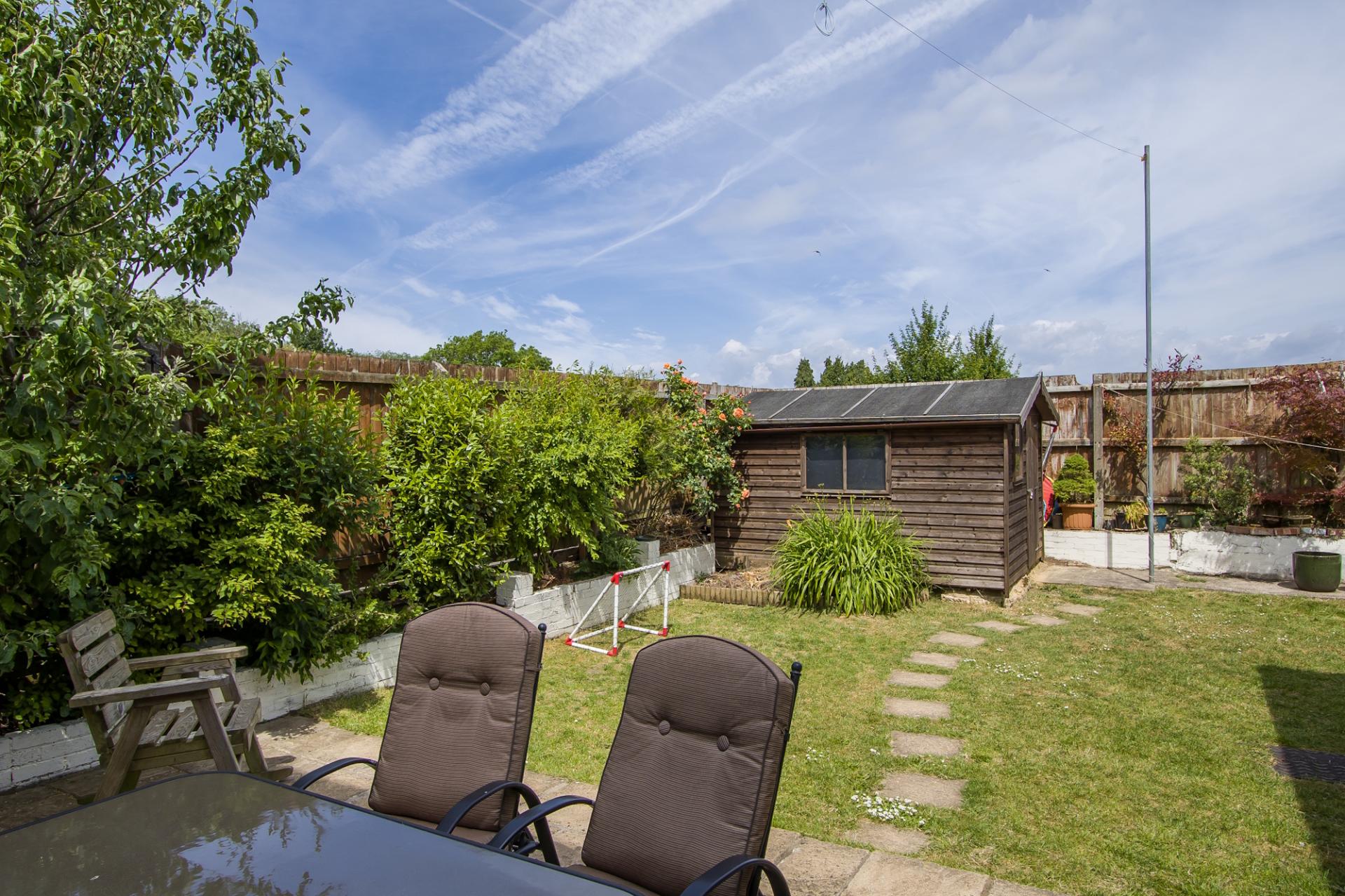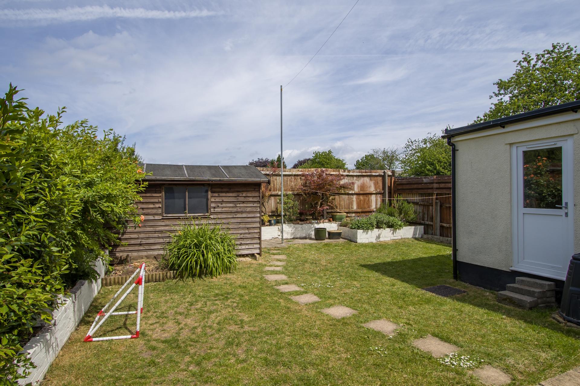 A very private rear garden that backs onto the playing fields. Areas of paved patio from the house and a lawn. Two timber sheds. Gated access to the front. There are raised beds at the side and bottom of the garden at the boundary fences.