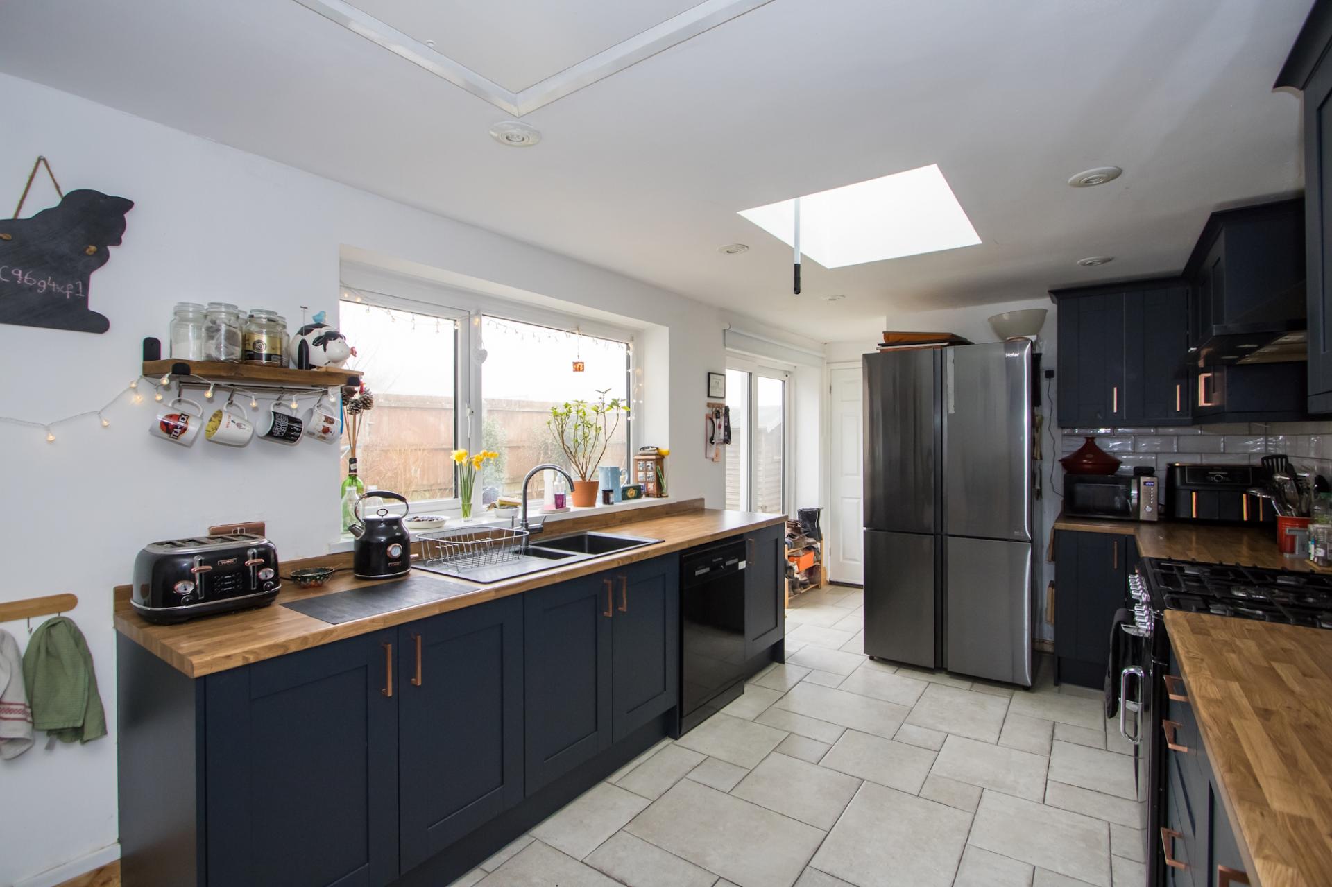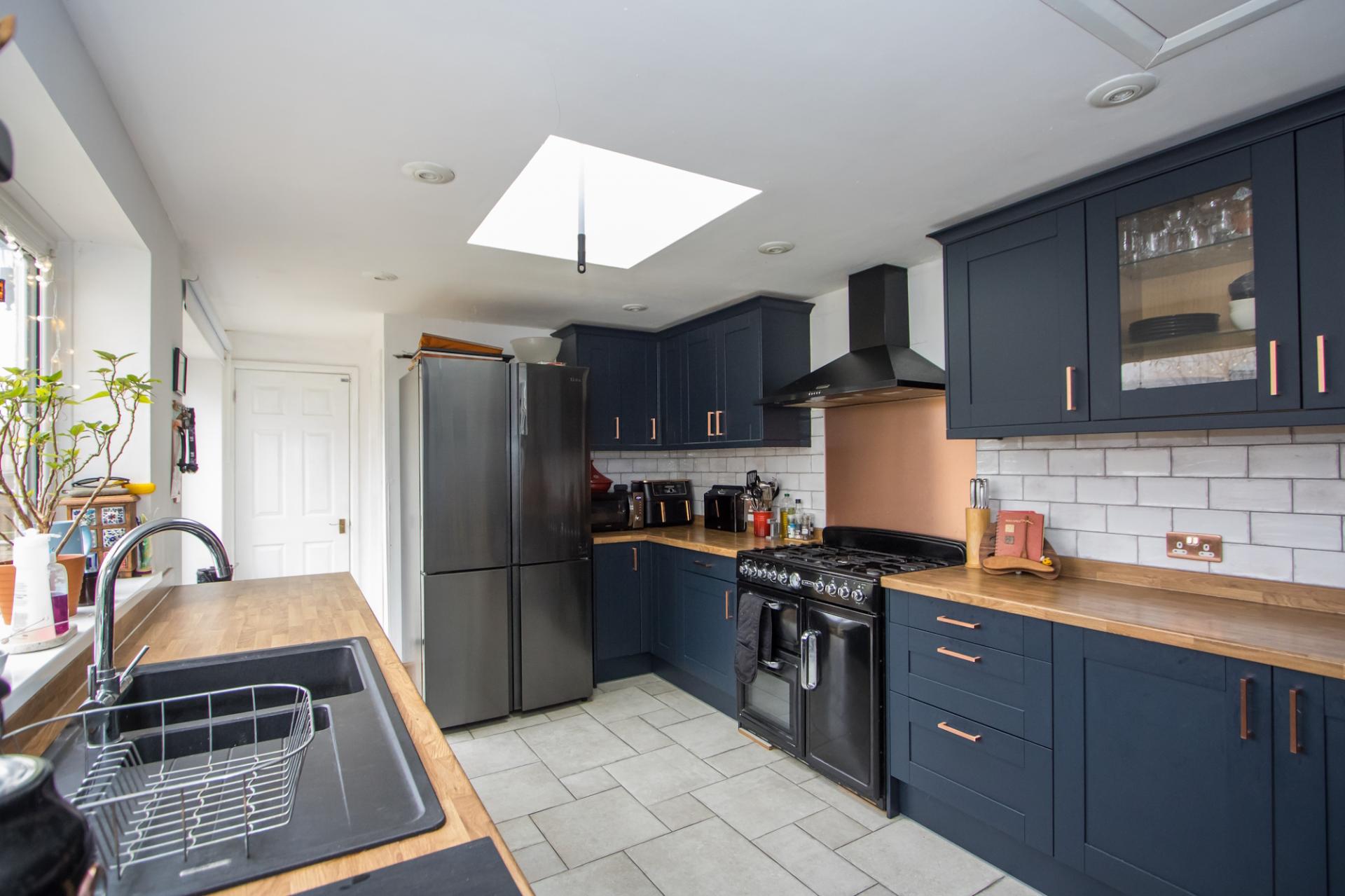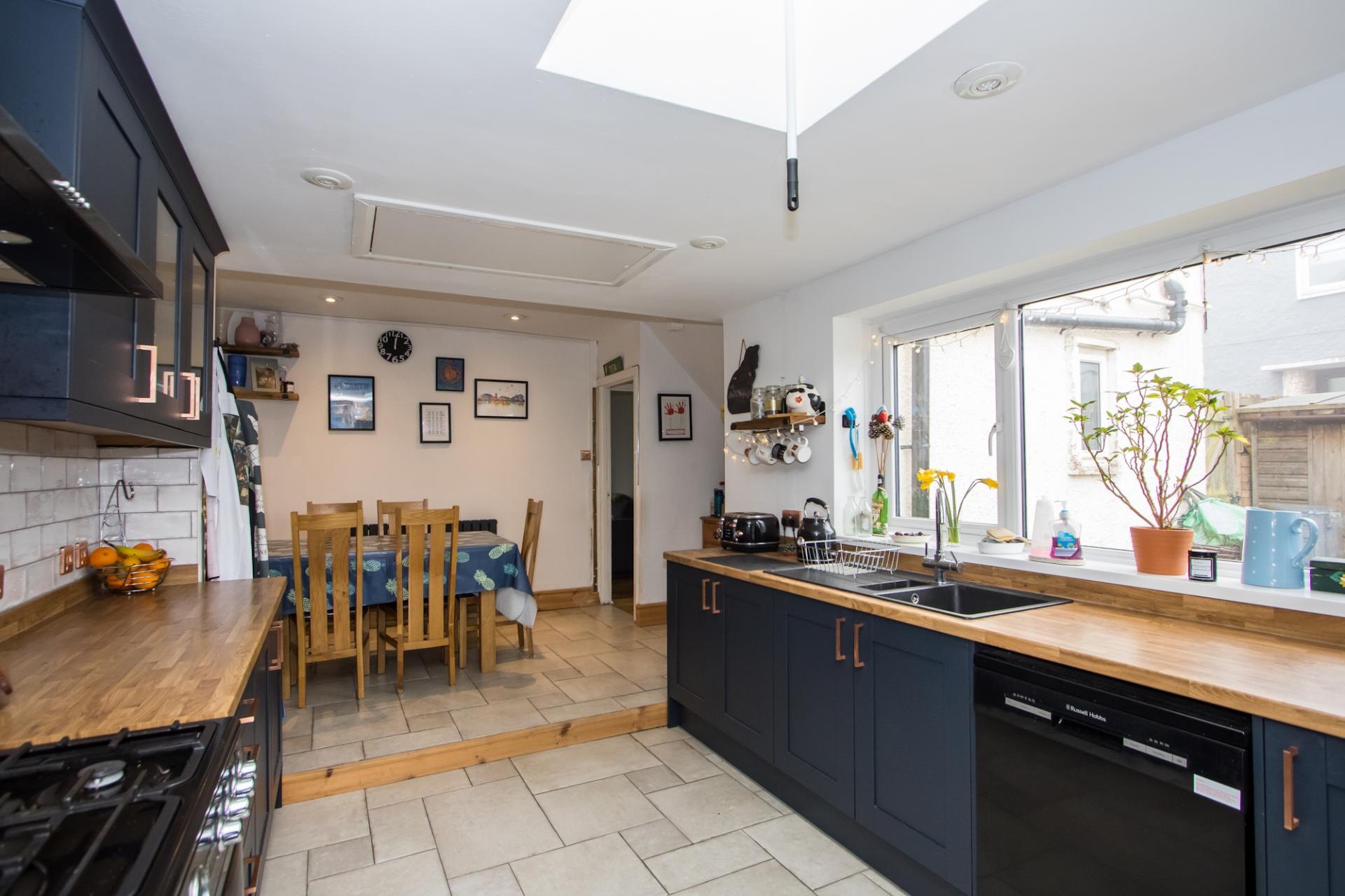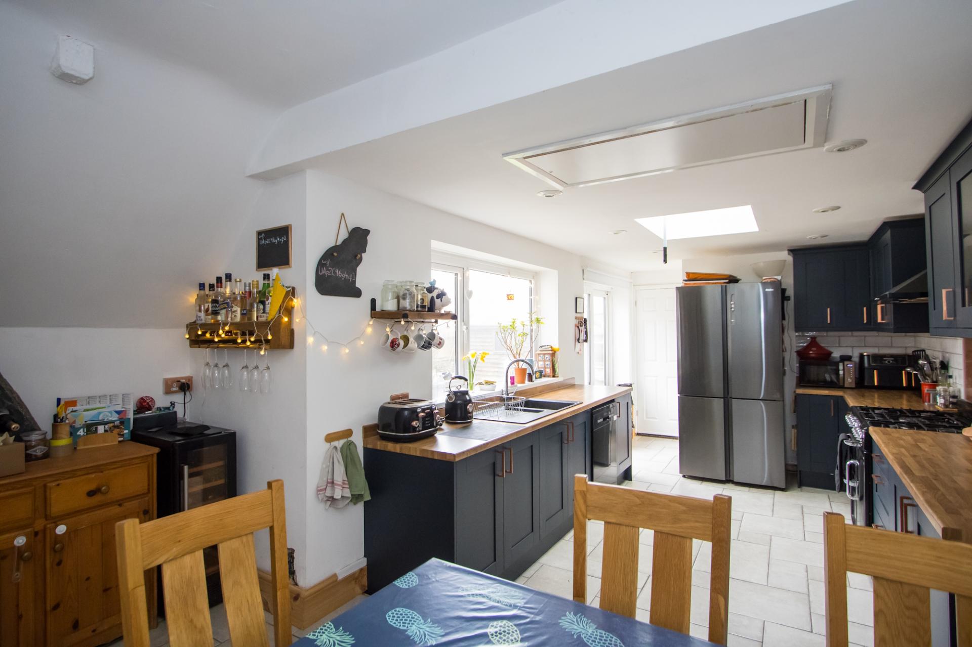 An open plan family space with kitchen and dining areas along with access to the WC and utility room to the back of the house. Tiled flooring throughout. Fitted kitchen comprising wall units and base units with dark blue shaker doors and wood effect laminate work surfaces. Range cooker with five burner gas hob, double electric oven and grill. Fitted extractor hood. Recess for an American style fridge freezer. Plumbing for dishwasher. One and a half bowl composite sink with drainer. uPVC double glazed window to the side and a Velux window. Recessed lights. Hatch to a loft space. Power points and central heating radiator.