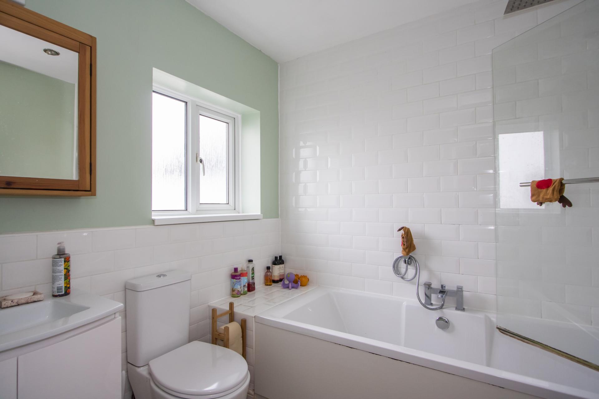 Wood effect vinyl flooring and a suite comprising a panelled bath with mixer shower and glass screen, WC and wash hand basin with storage below. uPVC double glazed window to the rear. Heated towel rail. Part tiled. Recessed lights. Extractor fan.