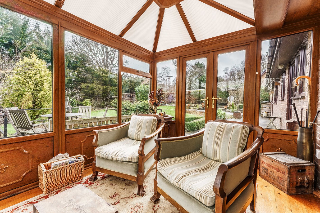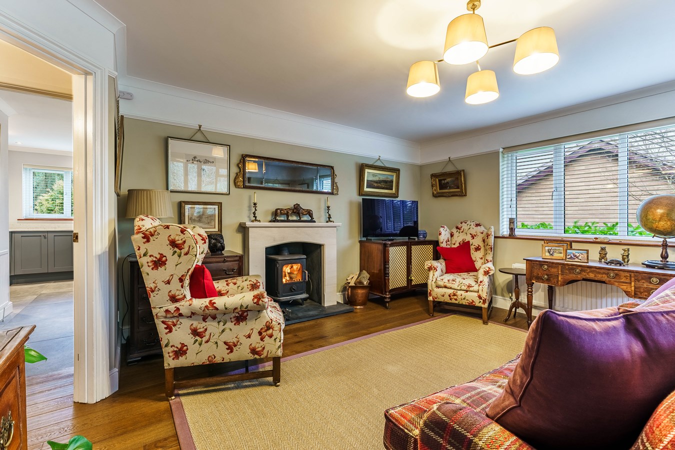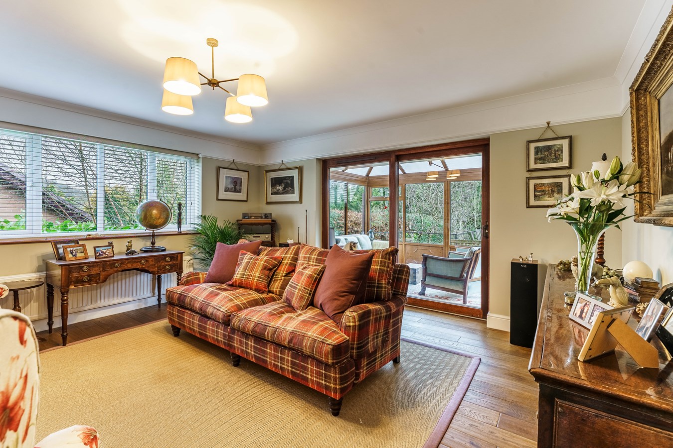 - Elegant living room with wood-burning stove, opening into a light-filled conservatory with garden views and access