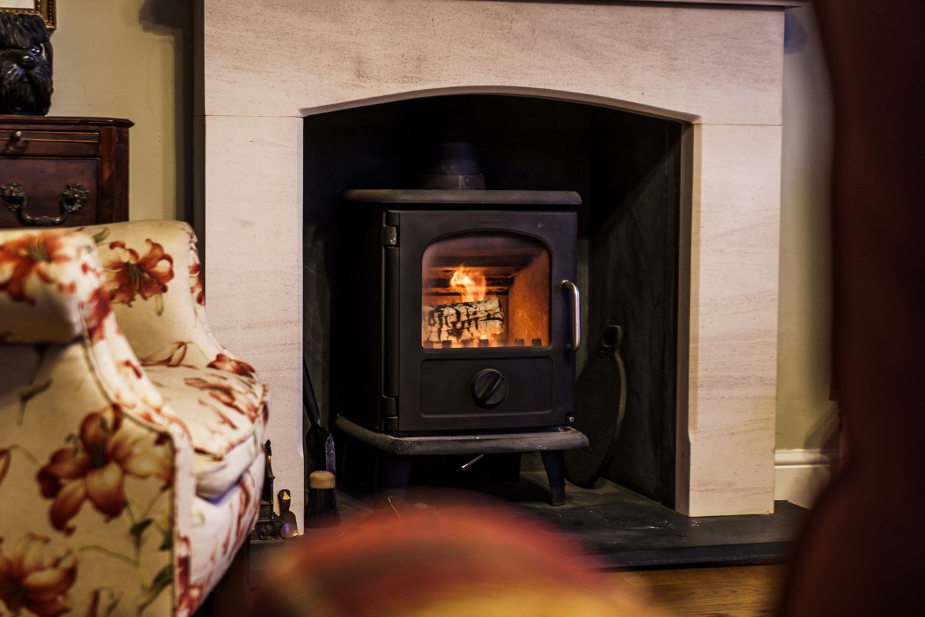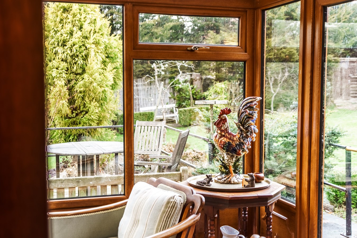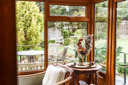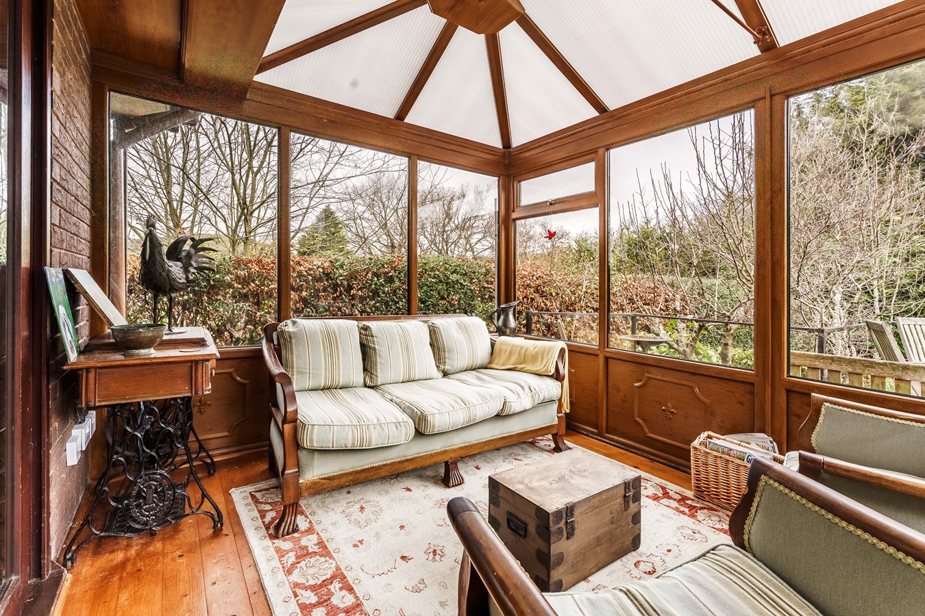 - Elegant living room with wood-burning stove, opening into a light-filled conservatory with garden views and access