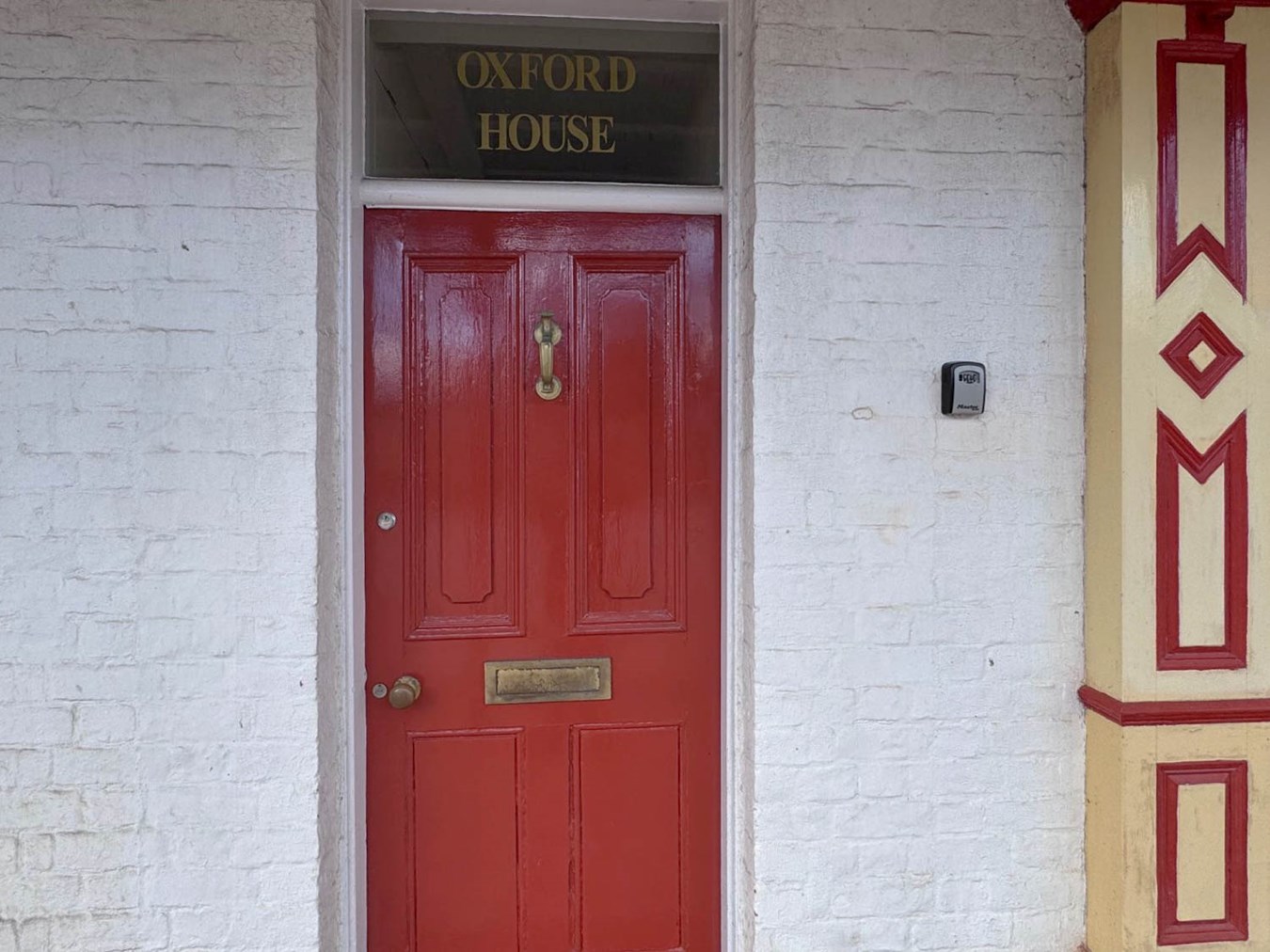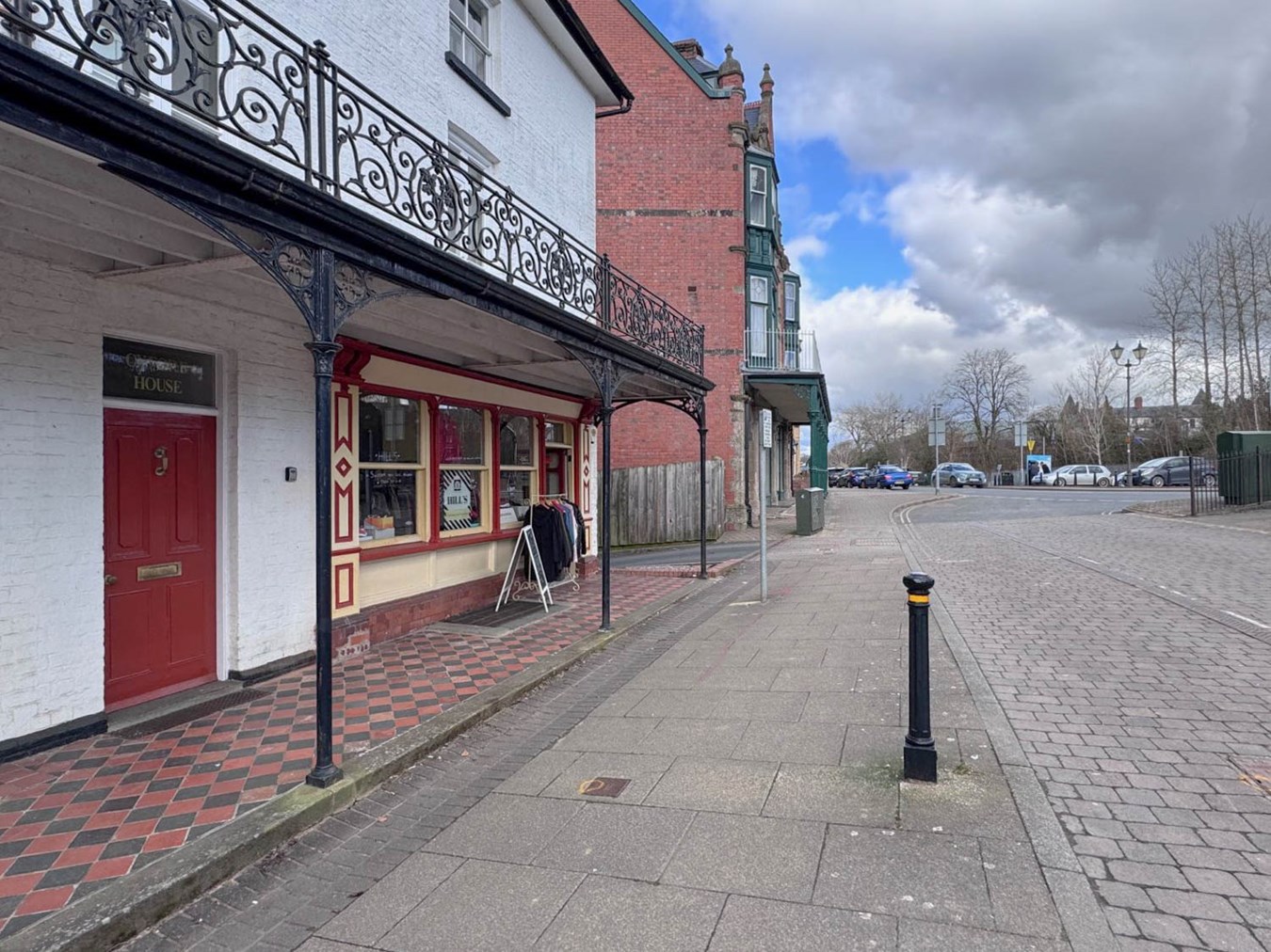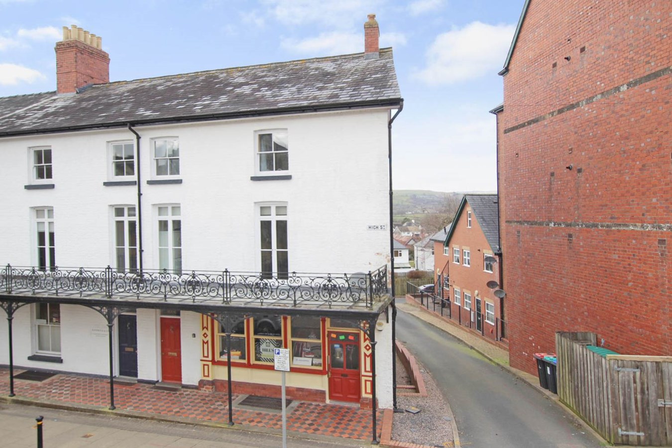 “Later C19 3-storey whitewashed brick front, slate roof, boxed eaves, large brick stack to centre left and smaller one to right gable end. Six windows wide (uneven spacing), 2-light sashes to second floor; taller 2-light casement windows to first floor opening on to balcony; all with deep reveals. Four-panel door to ground floor left with fanlight and plain shop front to right with recessed modern door. Two-light sash window beyond plus two four-panel doors with rectangular fanlights. Cycle shop front to far right with plain fascia supported on double scroll brackets to ends on broad pilasters with panelled decoration. Shop window of three grouped sashes and half-glazed door to right. Principal interest of this building is its ironwork six-bay balcony, with highly ornamental railings featuring foliage detailing, supported on cast iron columns with lightly foliated capitals and Gothic traceried spandrels. The ironwork continues at the sides, extending the full depth of the balcony.”