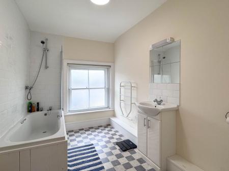 Upstairs, the second-floor landing provides additional storage and access to two generously sized bedrooms. The main bedroom, located at the front, is a large double with a superb built-in wardrobe. The guest bedroom, at the rear, shares the same attractive outlook as the dining area. A large family bathroom completes the accommodation, fitted with a panelled bath, low-flush WC, and a vanity unit with inset wash basin.