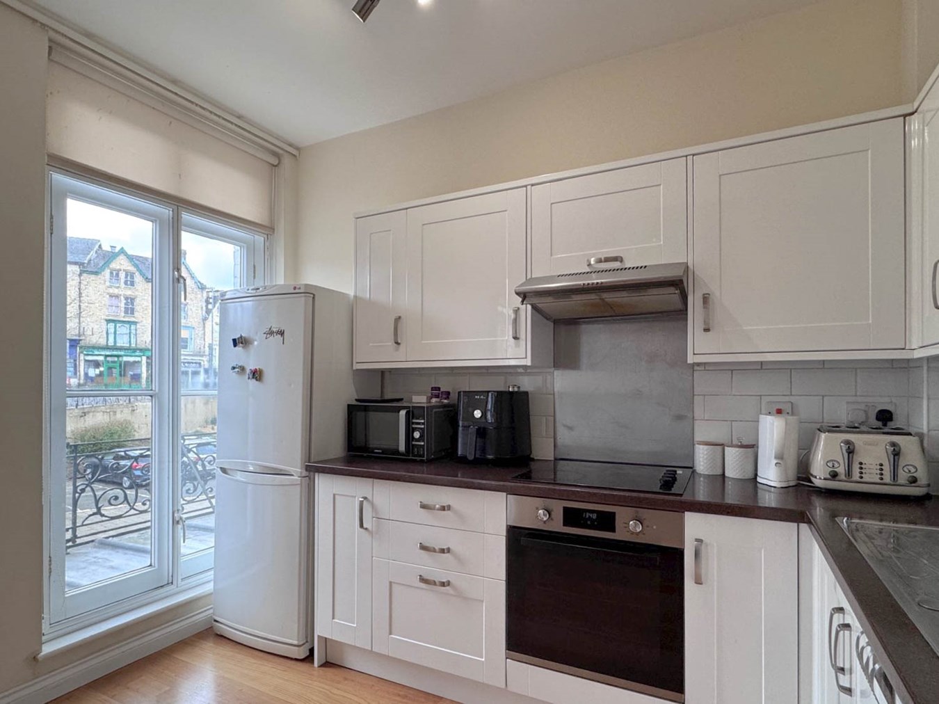 The first floor opens into a bright and spacious open-plan living area, with a dining space at the rear offering far-reaching views to the northwest. The front-facing reception room features Juliet balcony doors, allowing natural light to flood the space, and flows seamlessly into a modern fitted kitchen, which also enjoys matching Juliet balcony doors and ample space for cooking and food preparation.