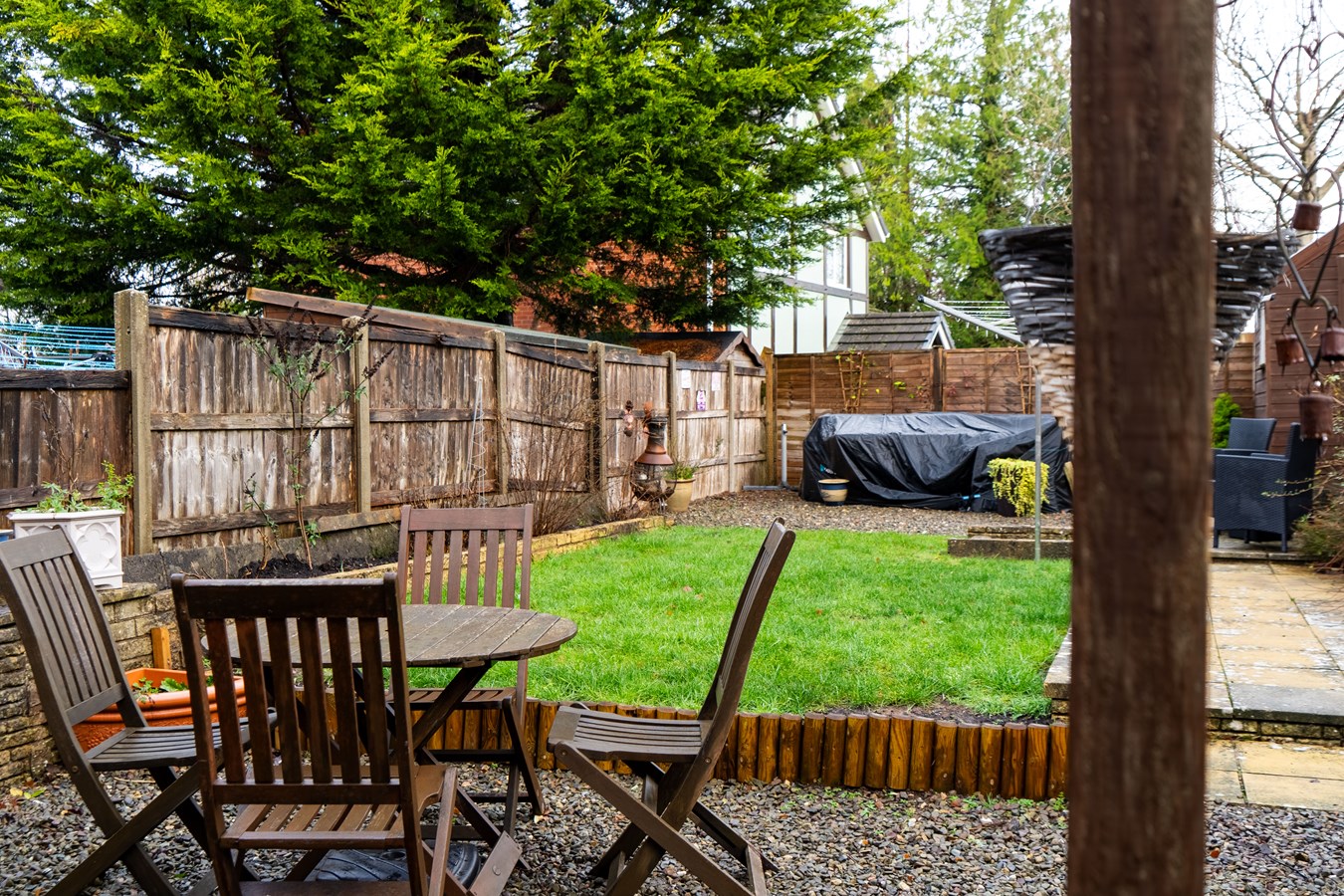 - Exceptional rear garden featuring a pergola-covered seating area, lawn, patio and additional gravelled area for outdoor dining, planting or recreation