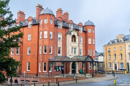 Queen Anne Period and Edwardian Baroque. 3-storey and attic brick front framed by octagonal, domed turrets and with advanced stuccoed giant arched entrance bay. Segmental dentilled pediment terminating in scrolls and supported by plain cornice on pilasters with Ionic-influenced capitals; arch to 2nd floor with shield and recessed window; 1st floor built out as a bay with horizontal cartouche above 2 sash windows with fluted columns to centre. Plain semi-circular arched entrance with panelled wooden doors. Large ironwork verandah projecting across front with semi-circular iron ribbed canopy to entrance with cresting to arch and ridge; rich scroll work and cast-iron columns with traceried spandrels and foliated capitals. Sash windows octagonal turrets almond-shaped pivot windows to the top floors with large keystones rising to brick eaves courses to leaded domed roofs. Hipped slate roof with exposed eaves and 2 brick stacks to front pitch 3 to left side. 3 semi-circular headed dormers with sash windows with glazing bars in architraves. Slightly advanced bays either side of centre with sashes linked by stuccoed heraldic panels.4-storey and attic left side (Norton Street) elevation on downhill slope to Rock Park. 4 semi-circular headed dormers and 3 splayed brick bays with concave stone parapets on moulded brackets and heraldic panels to the tops of each bay. Sash windows. Terrace of front continues around at 1st floor level to depth of one bay of left side with ironwork to railings and small openings within brick terrace wall. Later semi-octagonal 6-storey stone tower beyond in Baroque Revival style. Domed top with classical semi-frieze and broken pediments to 1st floor sash windows. Stepping further down the hill, 5-storey, 6-window block adjoining in similar light Baroque style. Brick with freestone dressings; parapet with detailed cornice below and shield to centre. 3 splayed bay to left with stone parapets and shields and large keystones. Other sash windows linked by ashlar panels and with broken pediments to 1st floor and triple Keystones to ground floor. Plain right-side elevation stepping down Ithon Road, 7-window wide, 3-storey basement and attic, 5 dormers, all sash windows. Interior retains fine entrance hall with two level galleries on 3 sides with ironwork banisters, wooden newel posts and repeated traceried patterns. Stuccoed and panelled ceiling, good Art Nouveau glass to all 3 floors and to staircase. Doors with sinuous detail, council room to right has classical plaster frieze and dentilled cornice.