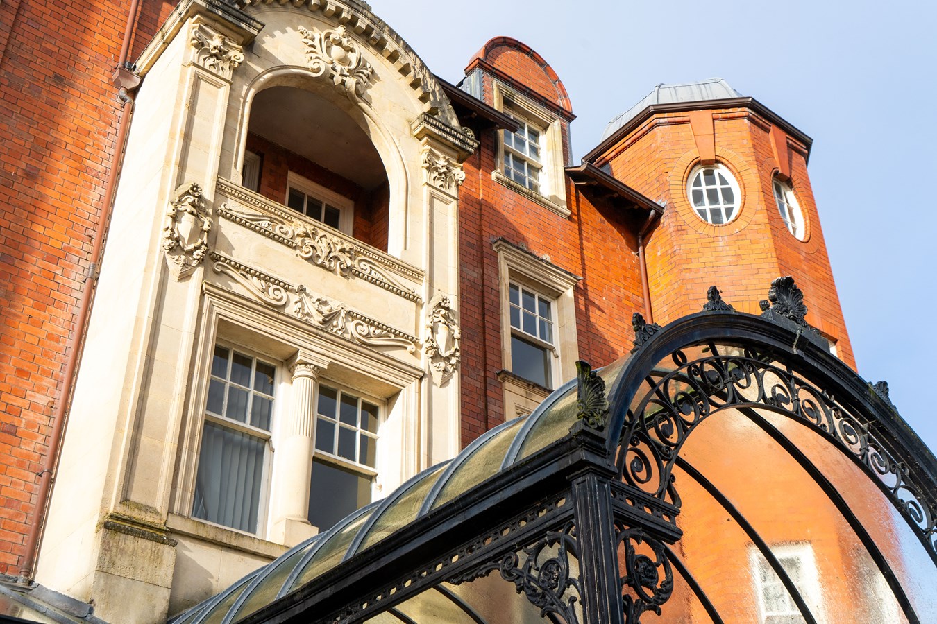 Designed by Swash & Bain, architects of Newport, the building was constructed in a classical Baroque Revival style with red brick and stone dressings. The Gwalia Hotel officially opened in 1900 and featured a symmetrical five-bay façade facing the corner of Norton Terrace and Ithon Road. The central bay was distinguished by a round-headed doorway at ground level, with pairs of sash windows on the first and second floors, flanked by ornate Ionic pilasters spanning both storeys. These supported a modillioned segmental pediment with a shield motif in the tympanum. The flanking bays featured sash windows separated by decorative stone panels, while the attic level boasted dormer windows with segmental pediments. The end bays were formed as octagonal towers, each crowned with an elegant dome.