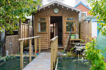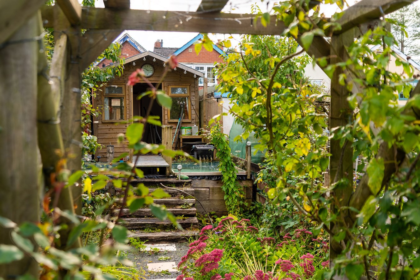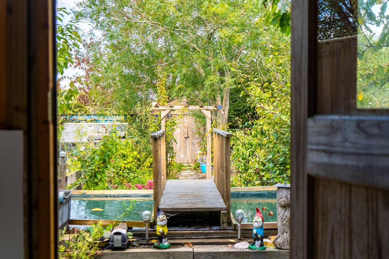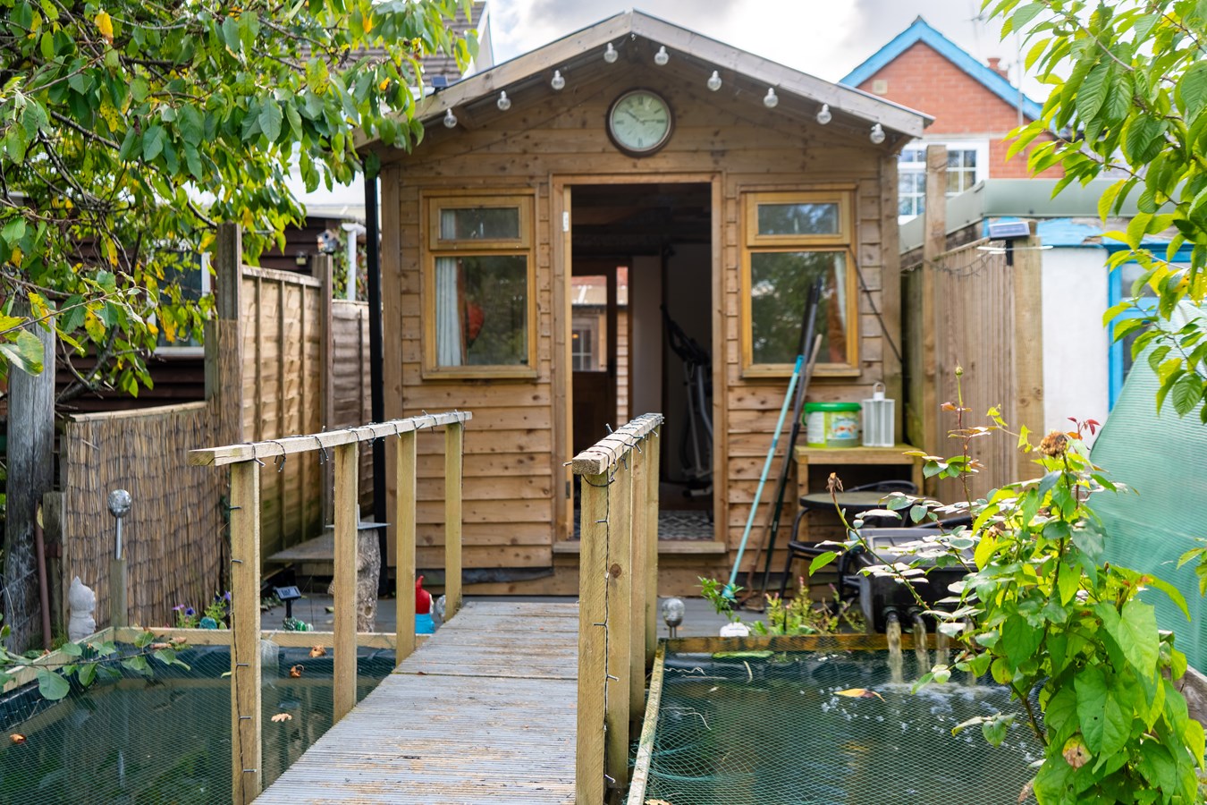 - Generous Victorian-style gardens with seating areas, raised decking, and a pond with a charming bridge