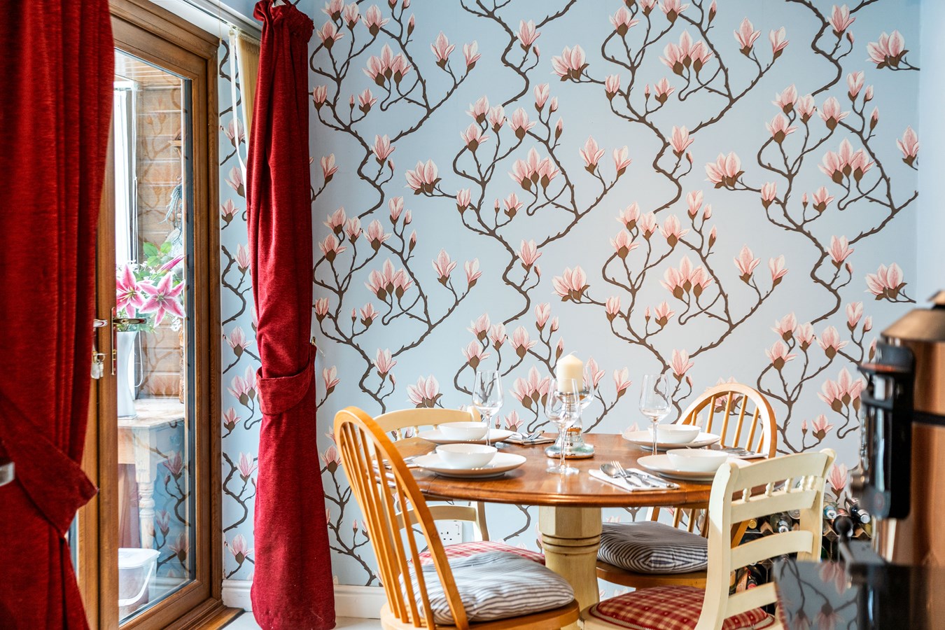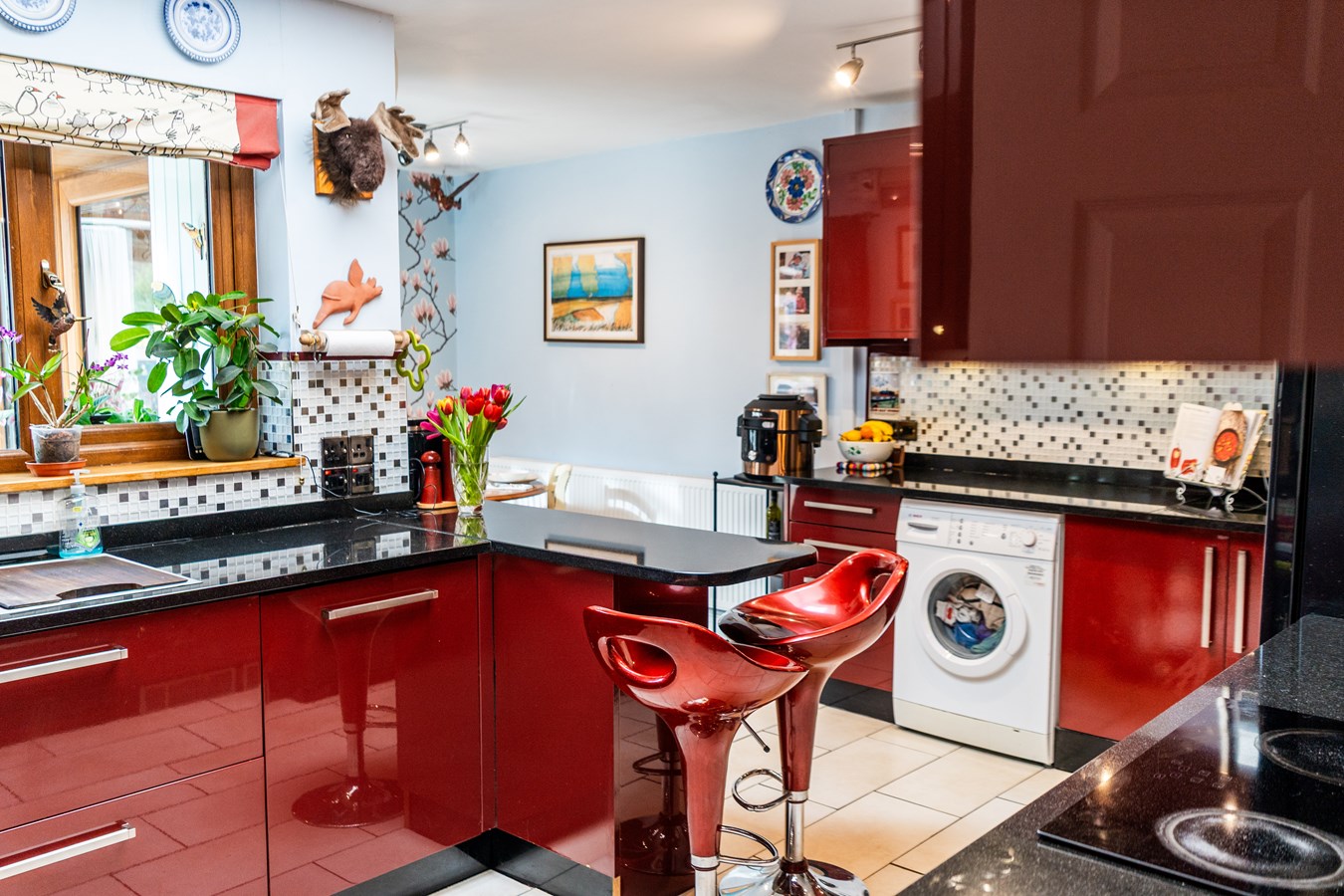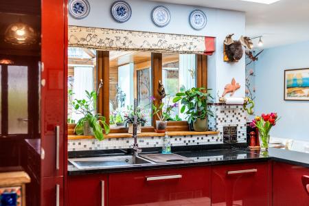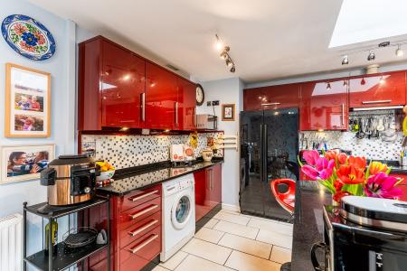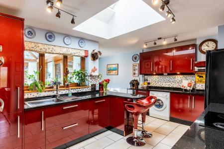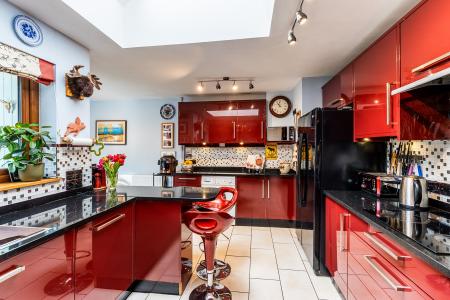 - Modern L-shaped kitchen/breakfast room with breakfast bar and French doors to conservatory