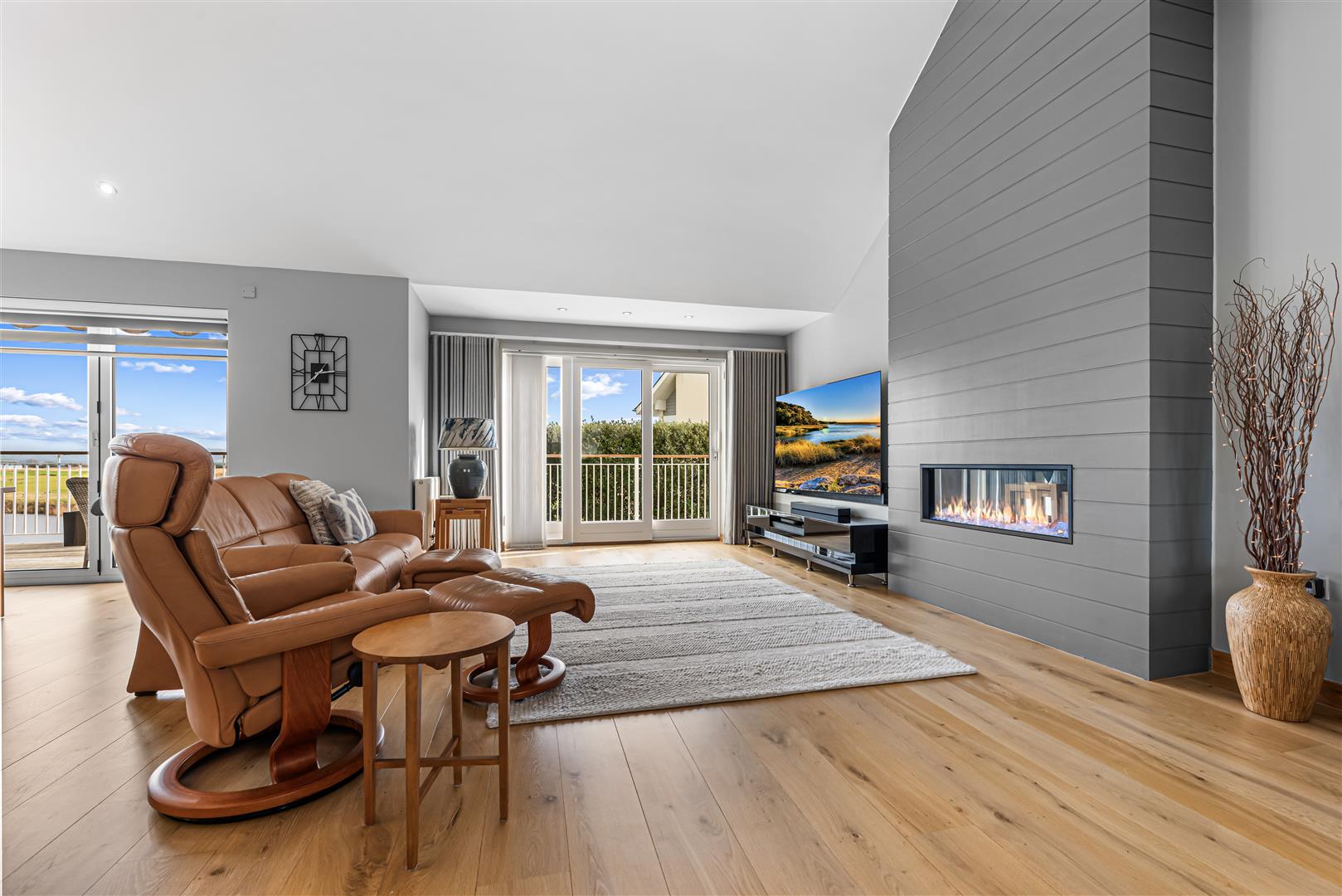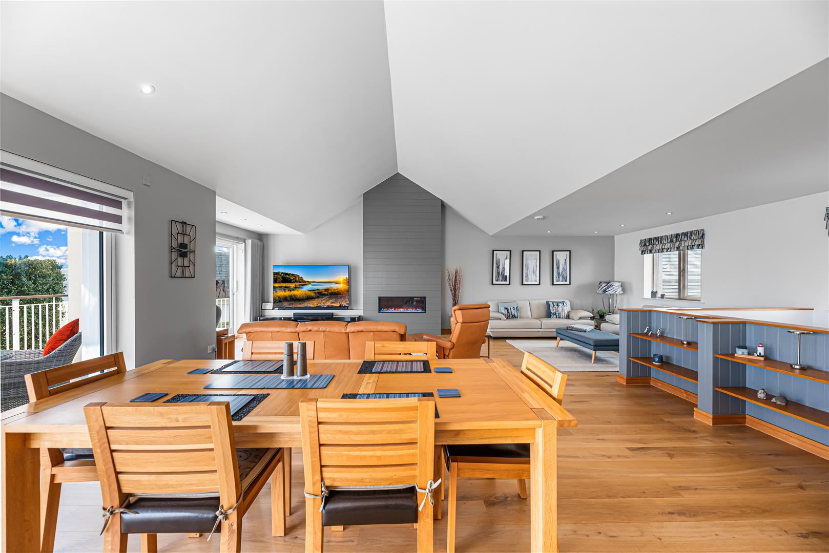 Open Plan Living/Dining Area - 8.12 x 7.57 (26'7" x 24'10") - A spectacular open-plan living space with vaulted ceilings and rich oak flooring, designed to maximise light and space. Full width lake-facing bi-fold & patio doors with remote-controlled electric blinds complement a built-in electric fire set within a panelled feature wall, creating a warm and inviting focal point. Generous in scale, the space effortlessly accommodates defined zones for relaxed seating, dining and entertaining. Expansive patio doors and bi-folds open onto a full-width balcony, effortlessly dissolving the boundary between indoors and out, framing panoramic views across the lake towards the manicured fairways.