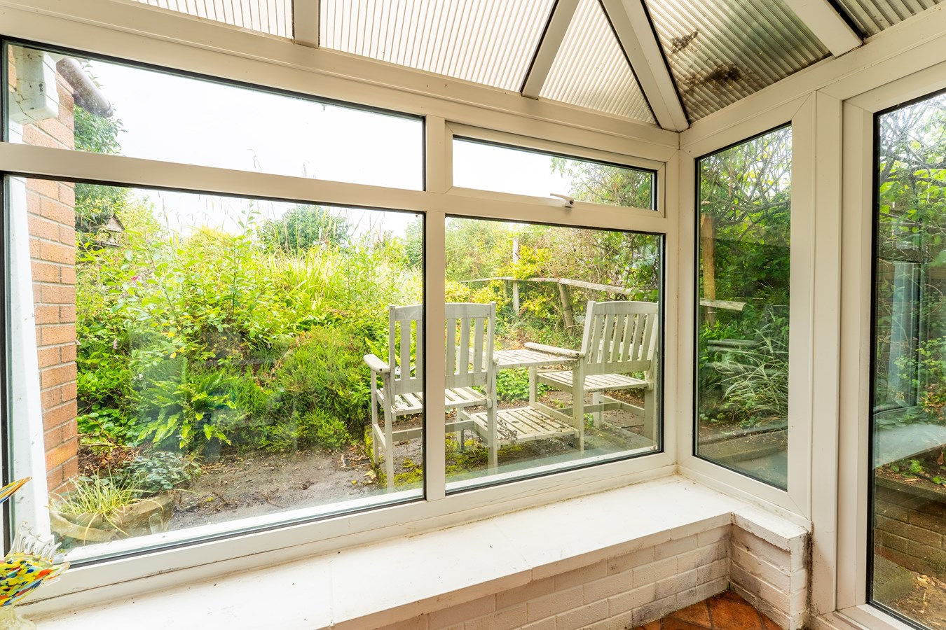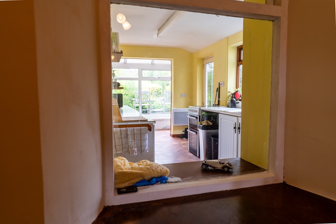 - Functional kitchen with potential, flowing into a light-filled sunroom and a separate storage/utility room
