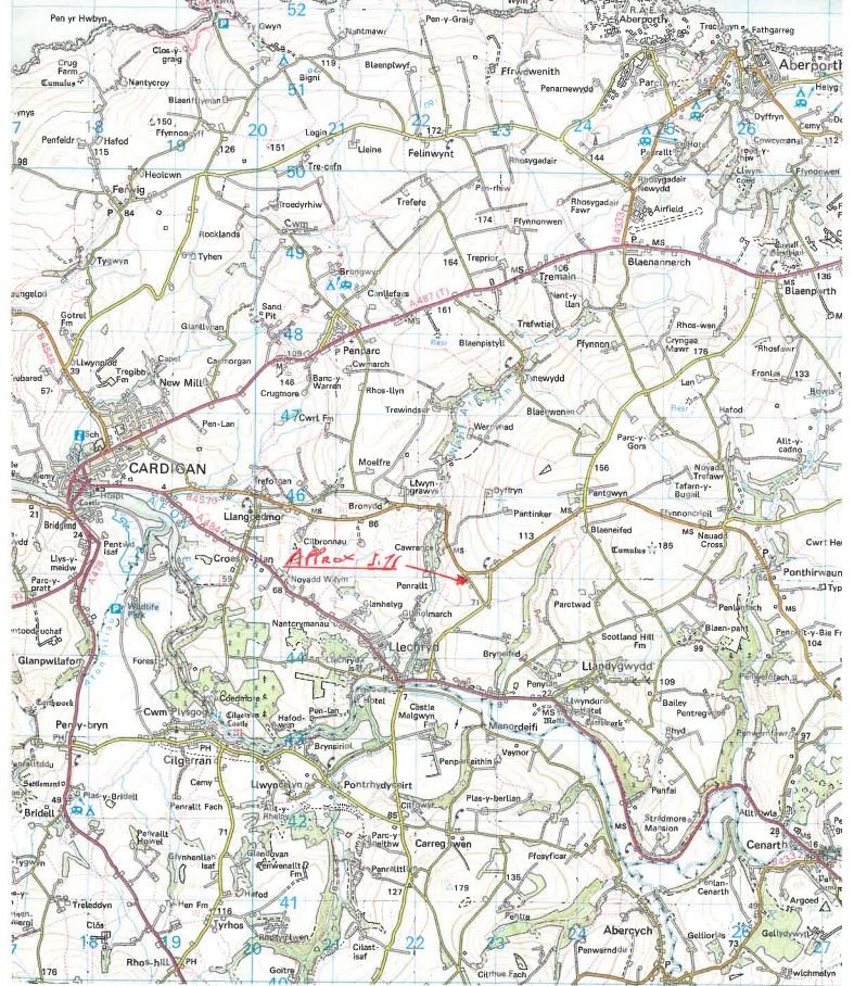Location - At OS grid reference SN225448 in a rural location between the B457 and the A484 within 1 mile of Llechryd village on a small spur off Lady Road (see location plan).