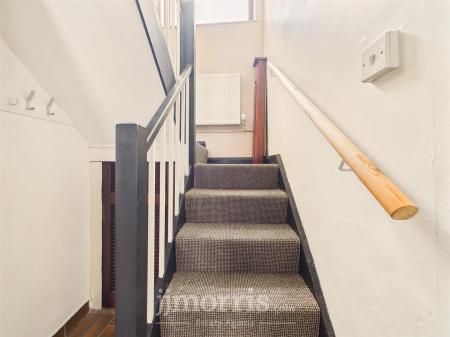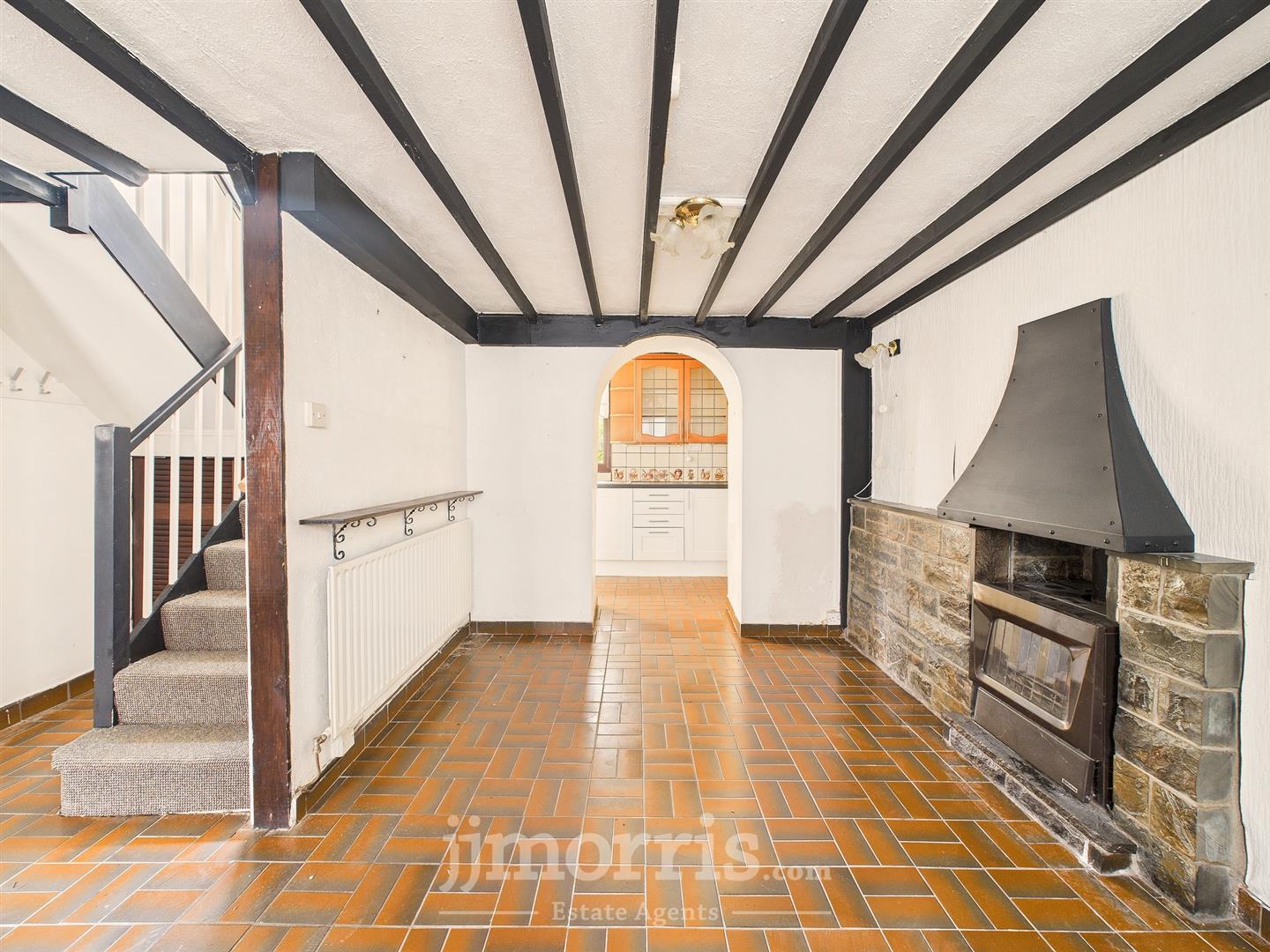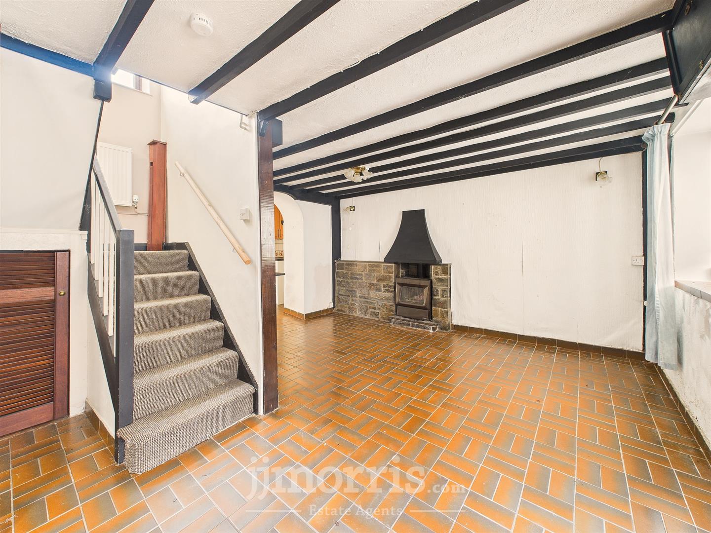 Sitting Room - 6.8 x 4.25 (22'3" x 13'11") - Originally two rooms, now a large open plan space with central staircase and understairs cupboard. Quarry tiled floor, beamed effect ceiling, two front-facing windows with tiled sills, two radiators, two stone fireplaces (one housing a Parkray solid fuel stove).