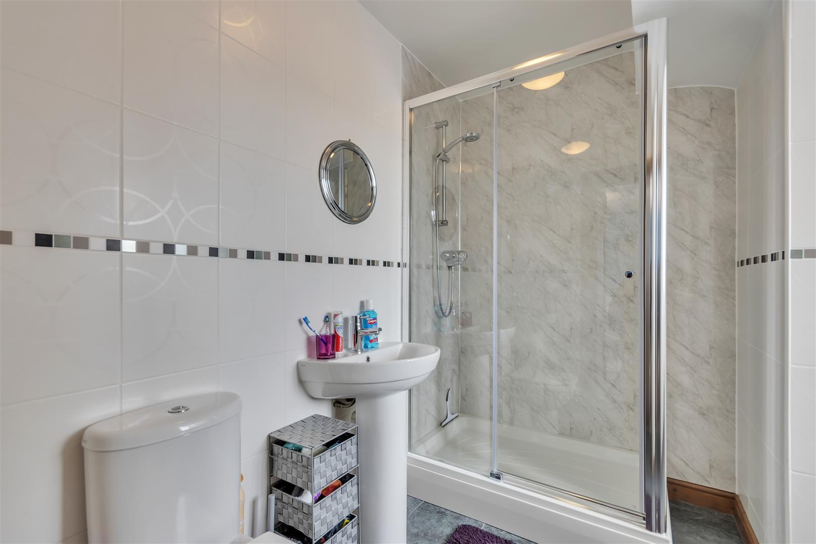 En Suite - 2.867 x 2.374 (9'4" x 7'9") - Front aspect UPVC frosted windows, single panel radiator with thermostatic valve, shower cubicle, low level WC, hand wash basin, tiled flooring