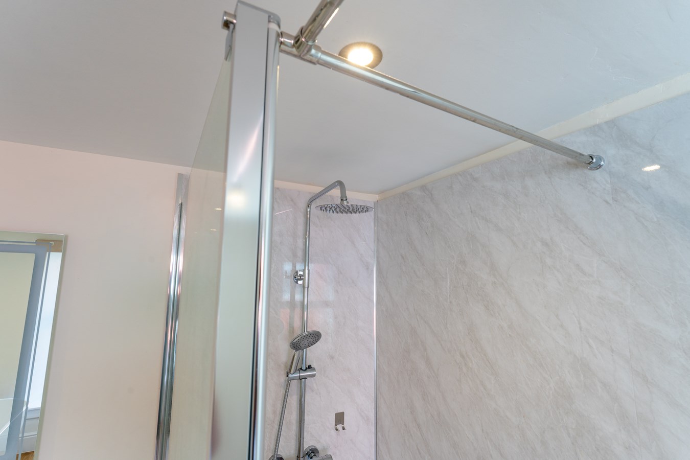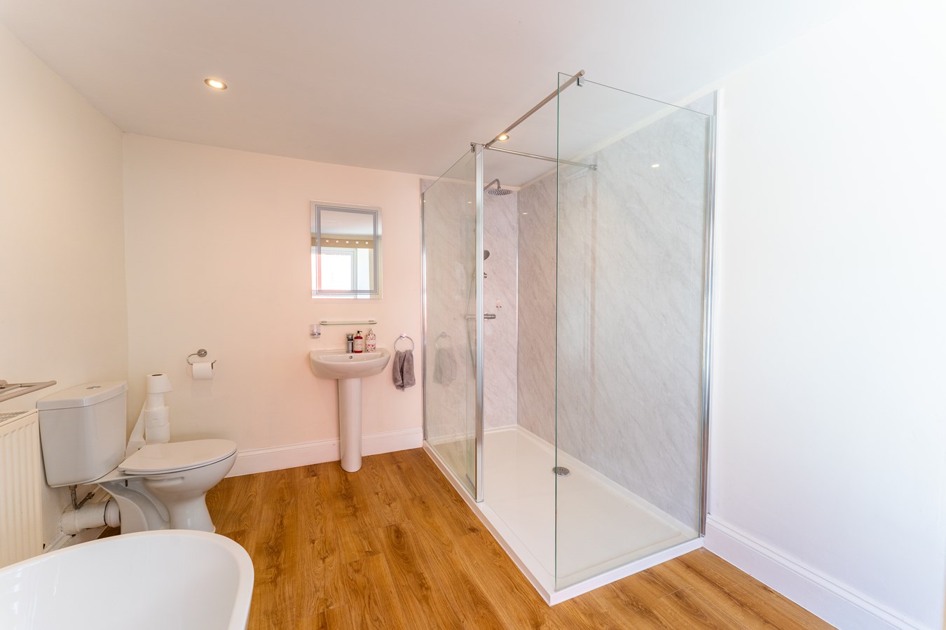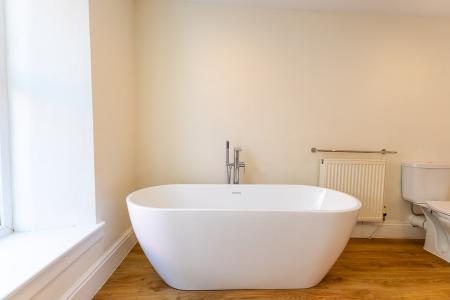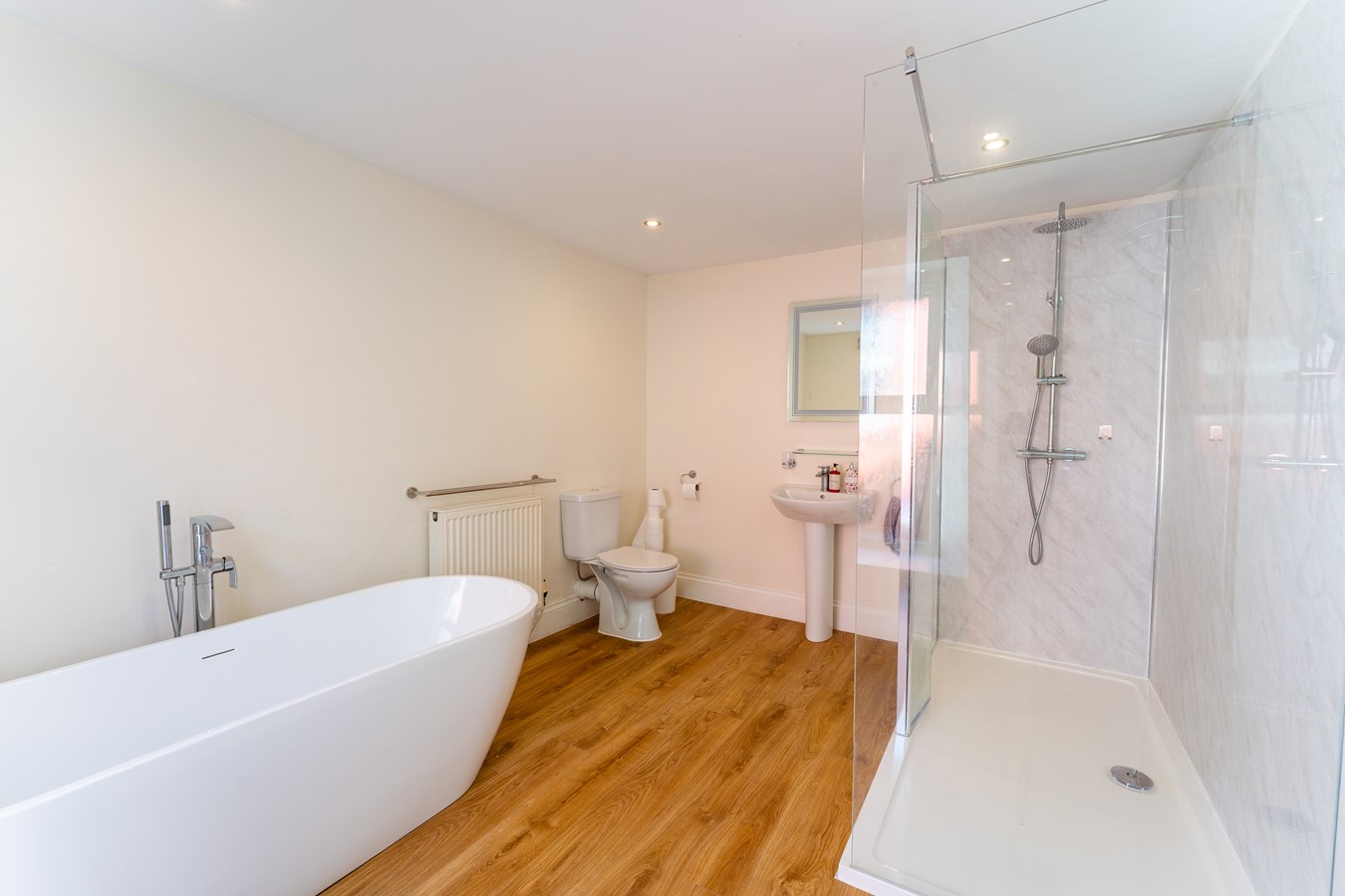 - Luxurious bathroom suite featuring a freestanding bath, walk-in rainfall shower, and elegant finishes