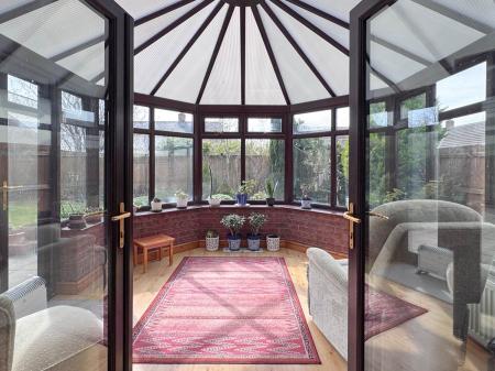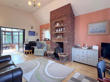 - Full-width principal reception room featuring a vaulted ceiling, striking brick fireplace with wood-burning stove, and adjoining conservatory overlooking the garden