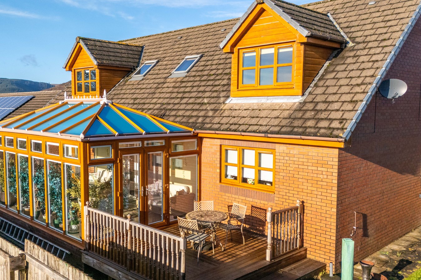 - Attractive wraparound gardens, generous parking, electric garage door and a decked terrace ideal for enjoying the views