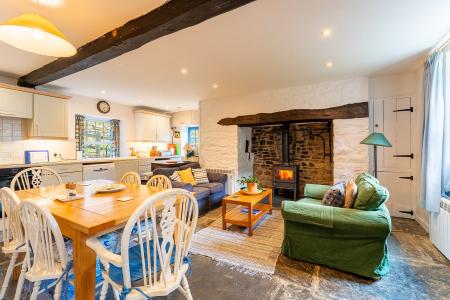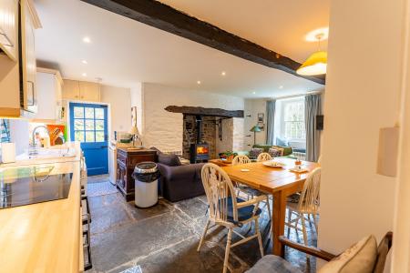 - Open-plan living: Kitchen/dining space with woodburning stove at the heart of the home
