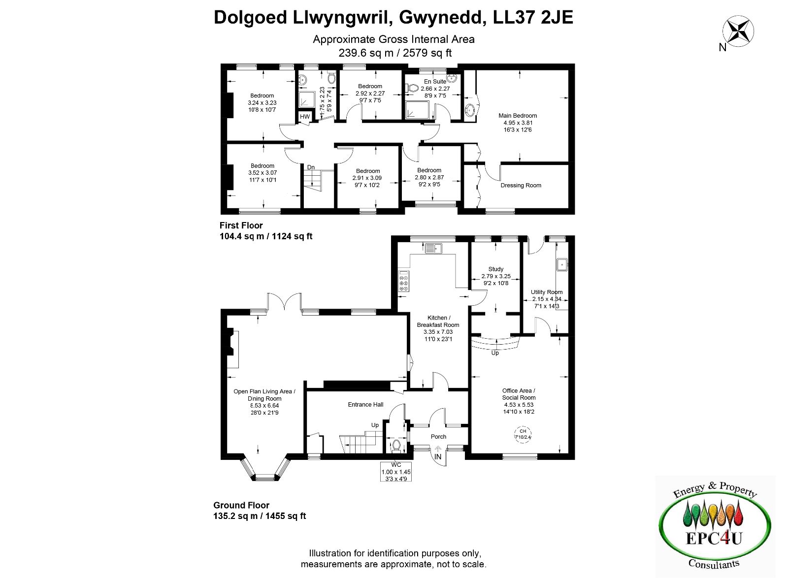 The property accommodation comprises:- entrance hallway, cloakroom, W.C. , sitting/dining room, kitchen/breakfast room, snug, utility room, reception room, first floor landing, 5 bedrooms, shower room, and master suite.
