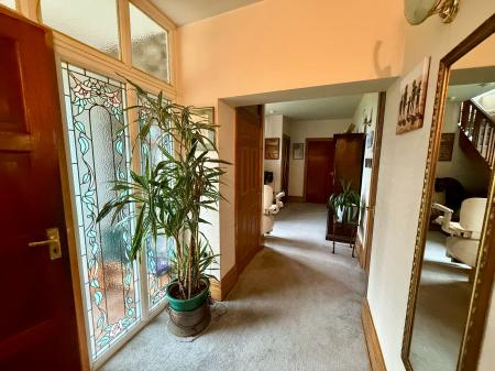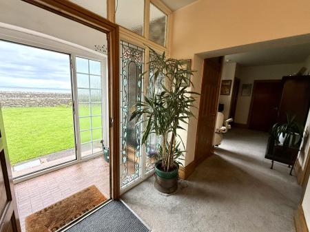 Door and stained glass window to front, storage cupboard, window to front with sea views, staircase to first floor, 2 radiators, carpet.