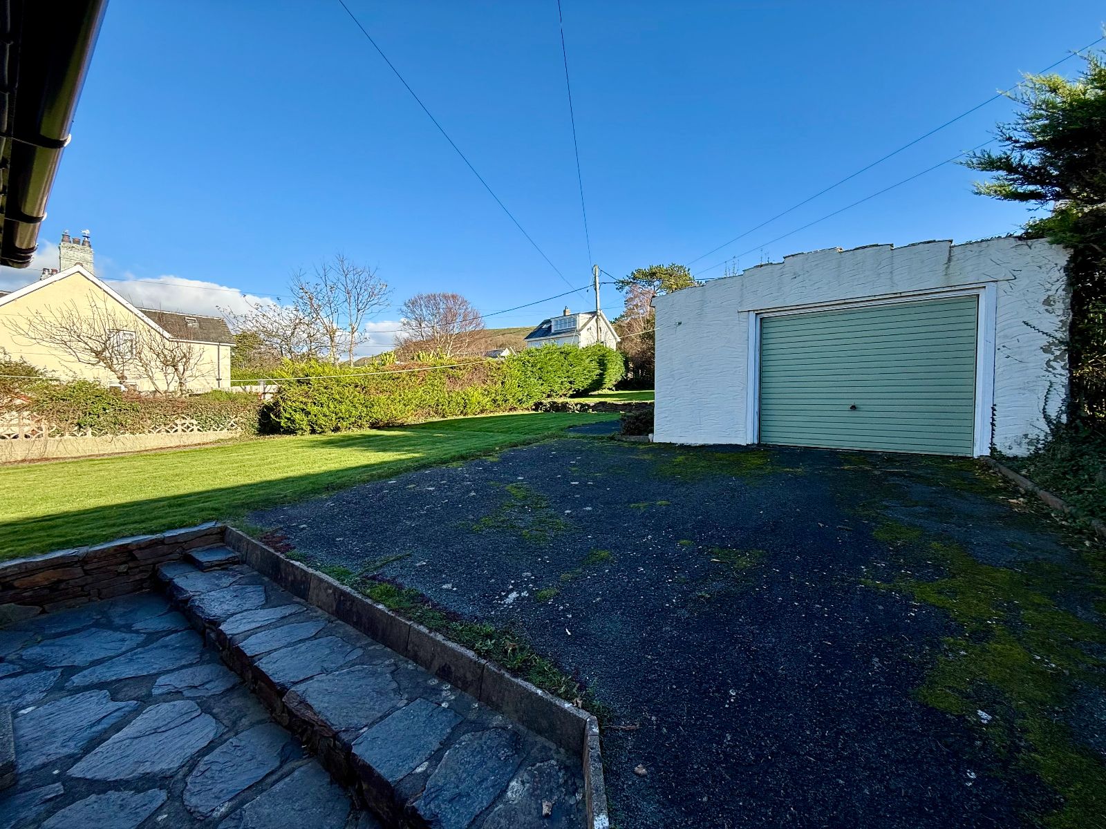 Side access to enclosed rear garden with detached garage, large lawn garden with hedged boundaries and mature shrubs, with distant coastal views.