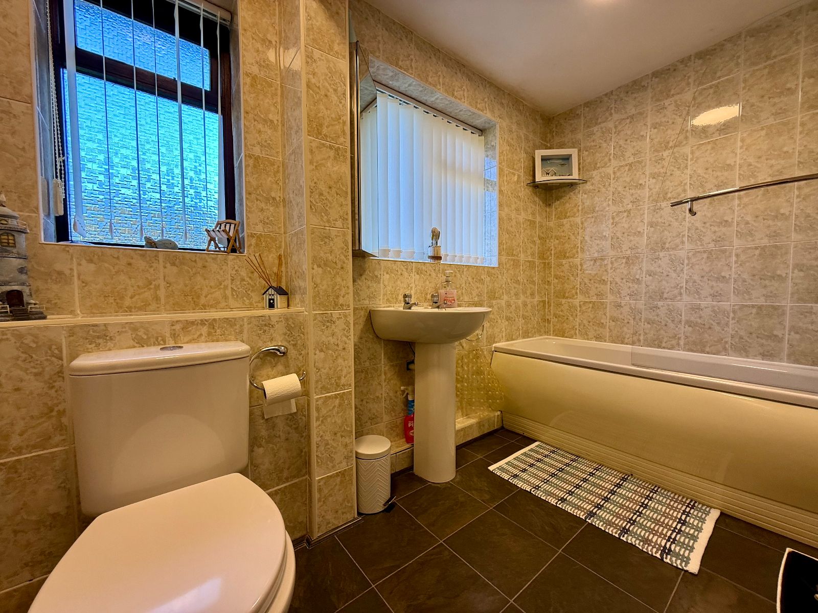 Two windows to rear, fully tiled walls, panel bath with mains shower above and shower screen, pedestal wash hand basin, low level W.C., radiator, tiled floor.