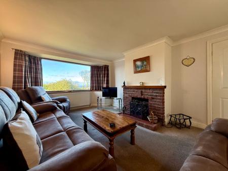 Bay window to front with sea views and far distant views of the Llyn Peninsula, window to side, coved ceiling, feature red brick open fireplace with quarry tiled hearth, wall lights, radiator, carpet.