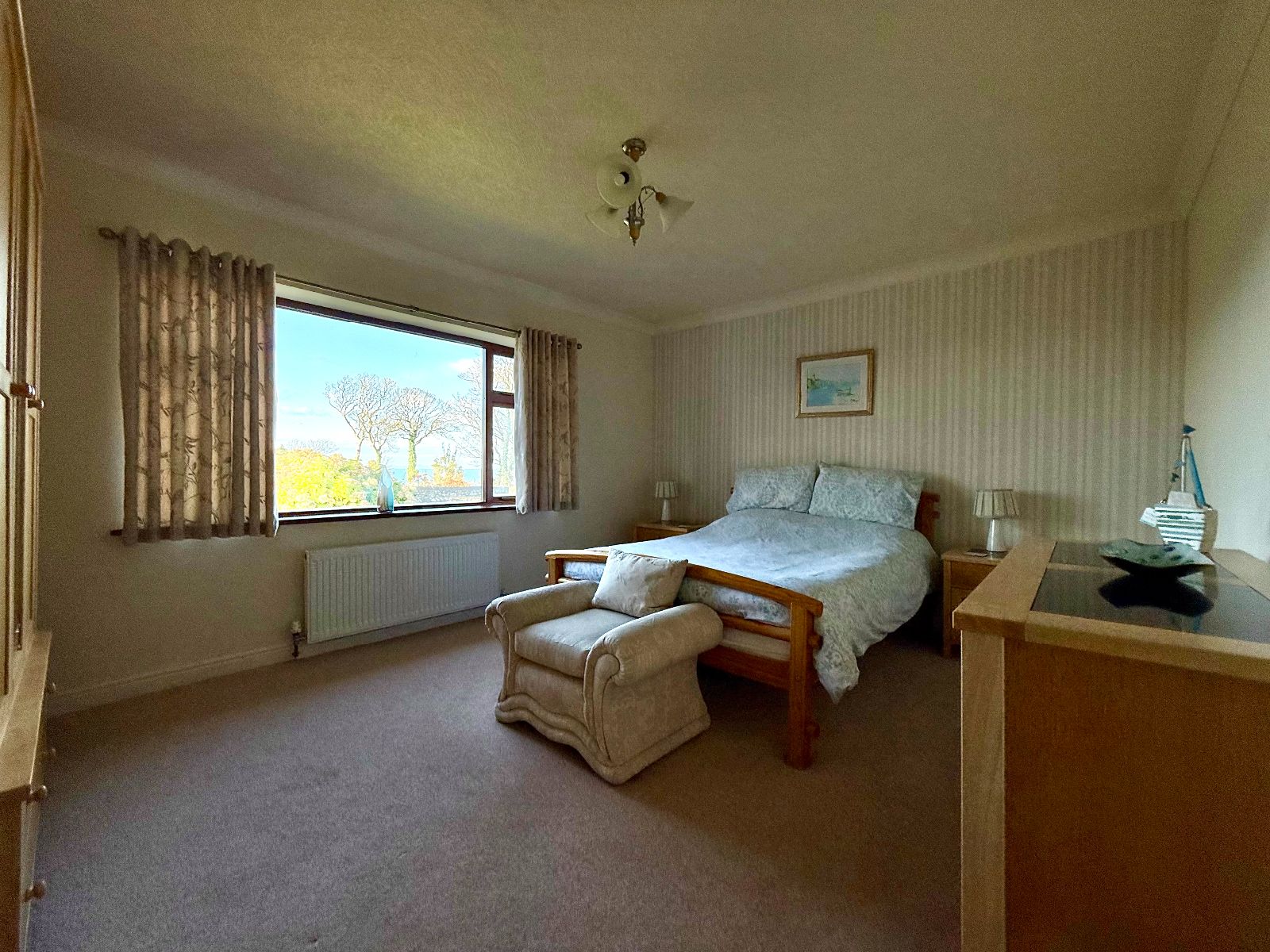 Window to front with sea views and far distant views of the Llyn Peninsula, coved ceiling, radiator, carpet.