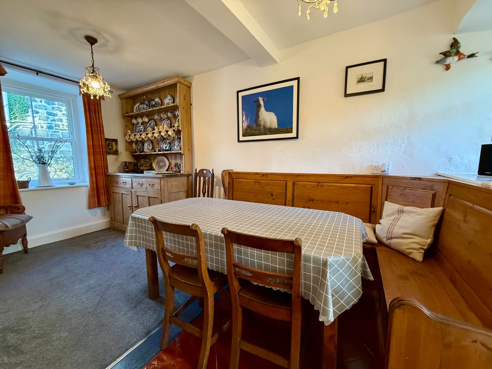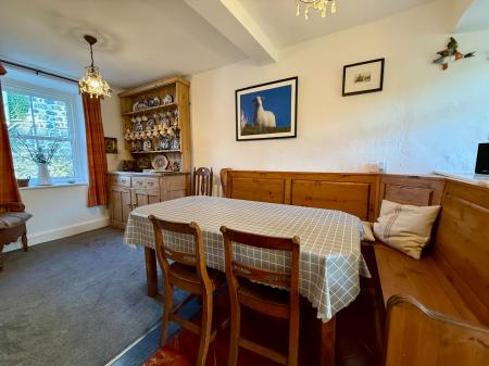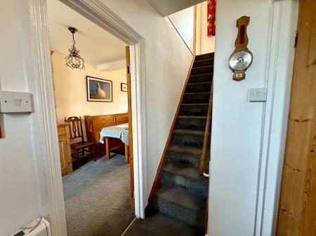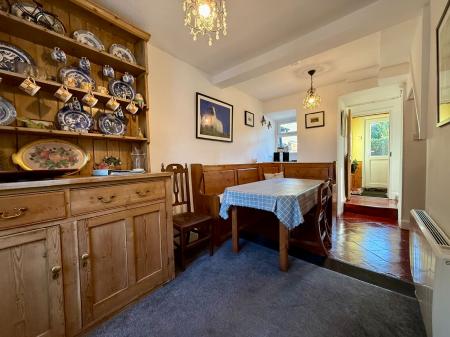 Window to front and rear, dining area with fitted bench seating, electric heater, understairs cupboard, partially carpeted and, part quarry tiled flooring.
