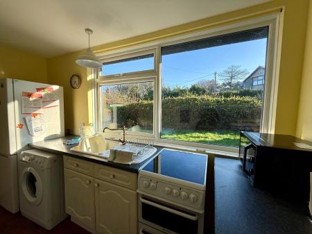 Window to rear, 4 base units under a marble effect worktop, composite sink and drainer, space for a electric cooker, space for a fridge freezer, space for a washing machine, electric heater, quarry tiled floor.