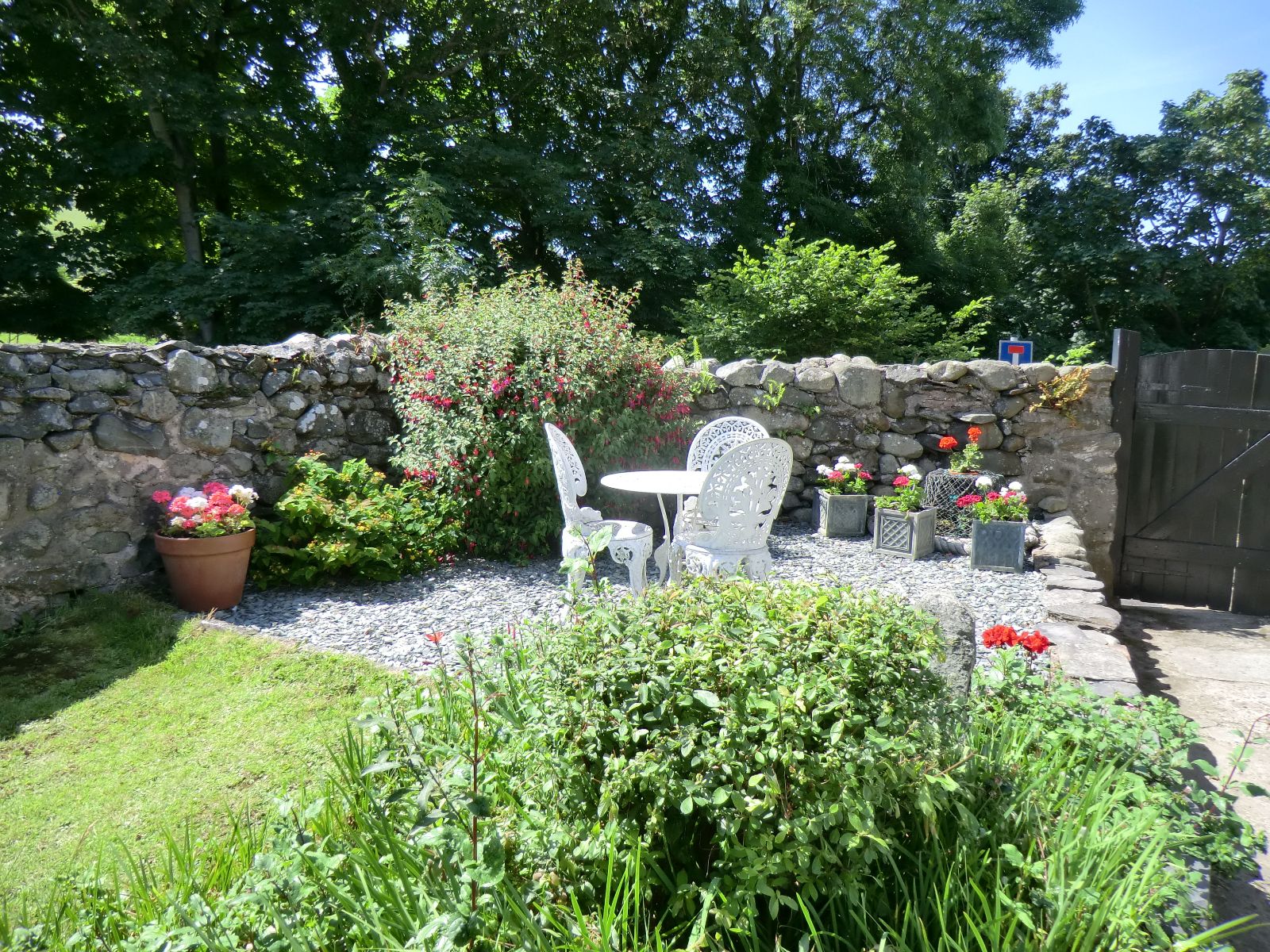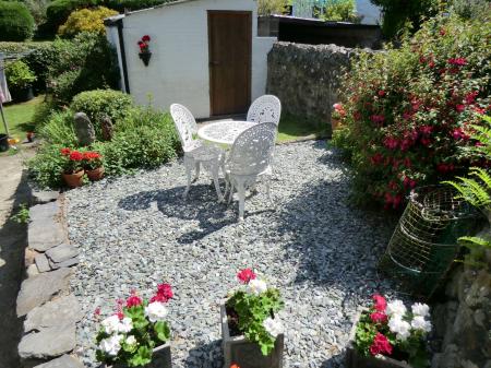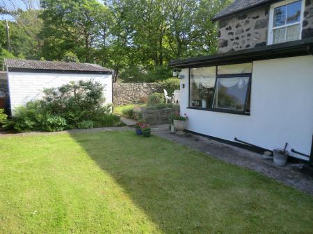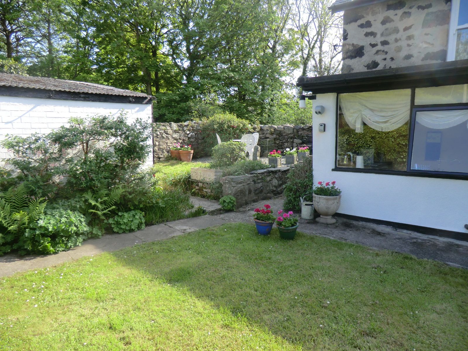 A charming garden lies to the side and rear of the property, enclosed by stone boundary walls with a side gate providing access from the lane. The garden features slate shale and lawned areas, along with a patio at the rear. A brick-built outbuilding with a slated roof offers useful storage space.