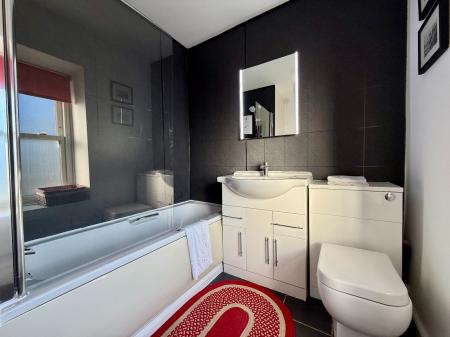 Window to rear, low level WC, vanity wash hand basin, panelled bath with electric shower overhead, shower screen, airing cupboard housing hot water tank, electric panel heater, tiled flooring.
