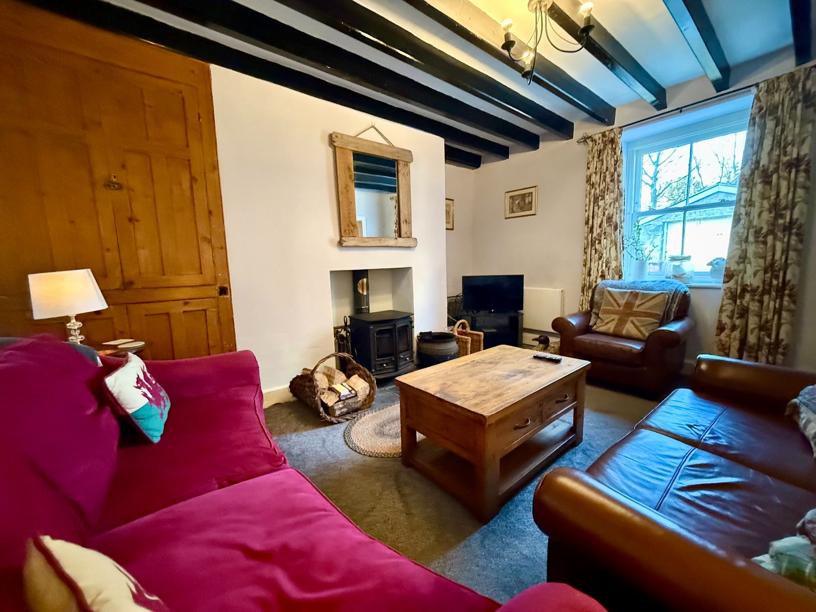 Window to front, beamed ceiling, multi fuel stove on a tiled hearth, alcove storage cupboards, electric heater, carpet.
