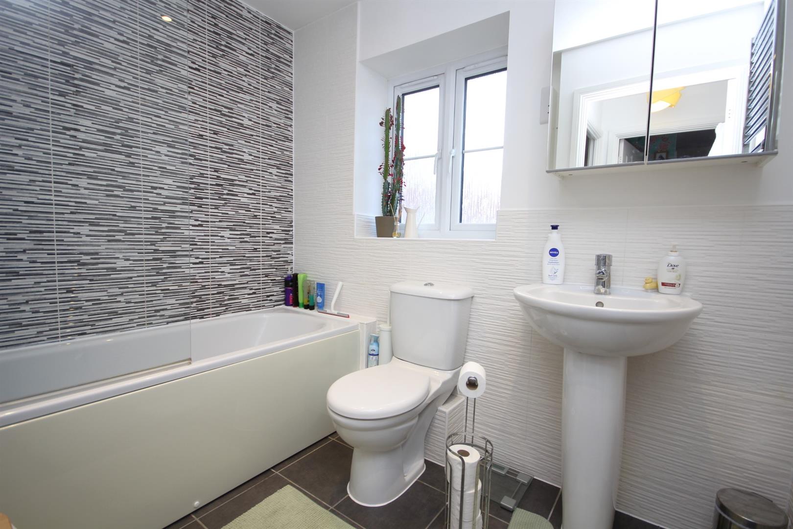 Modern bathroom comprising three piece white suite & attractive wall tiling