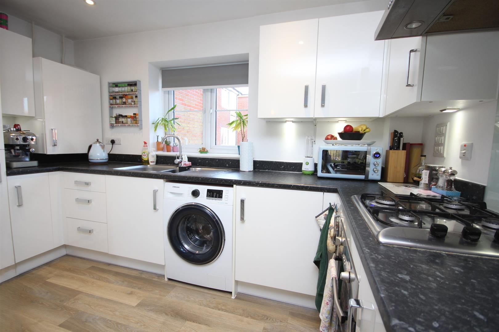 Modern kitchen boasting built in oven, hob, fridge freezer & space for washing machine