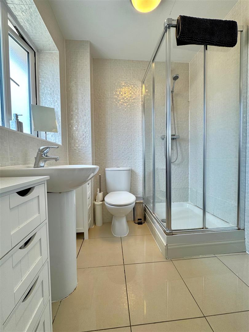 Modern en-suite shower room comprising three piece white suite & attractive wall tiling