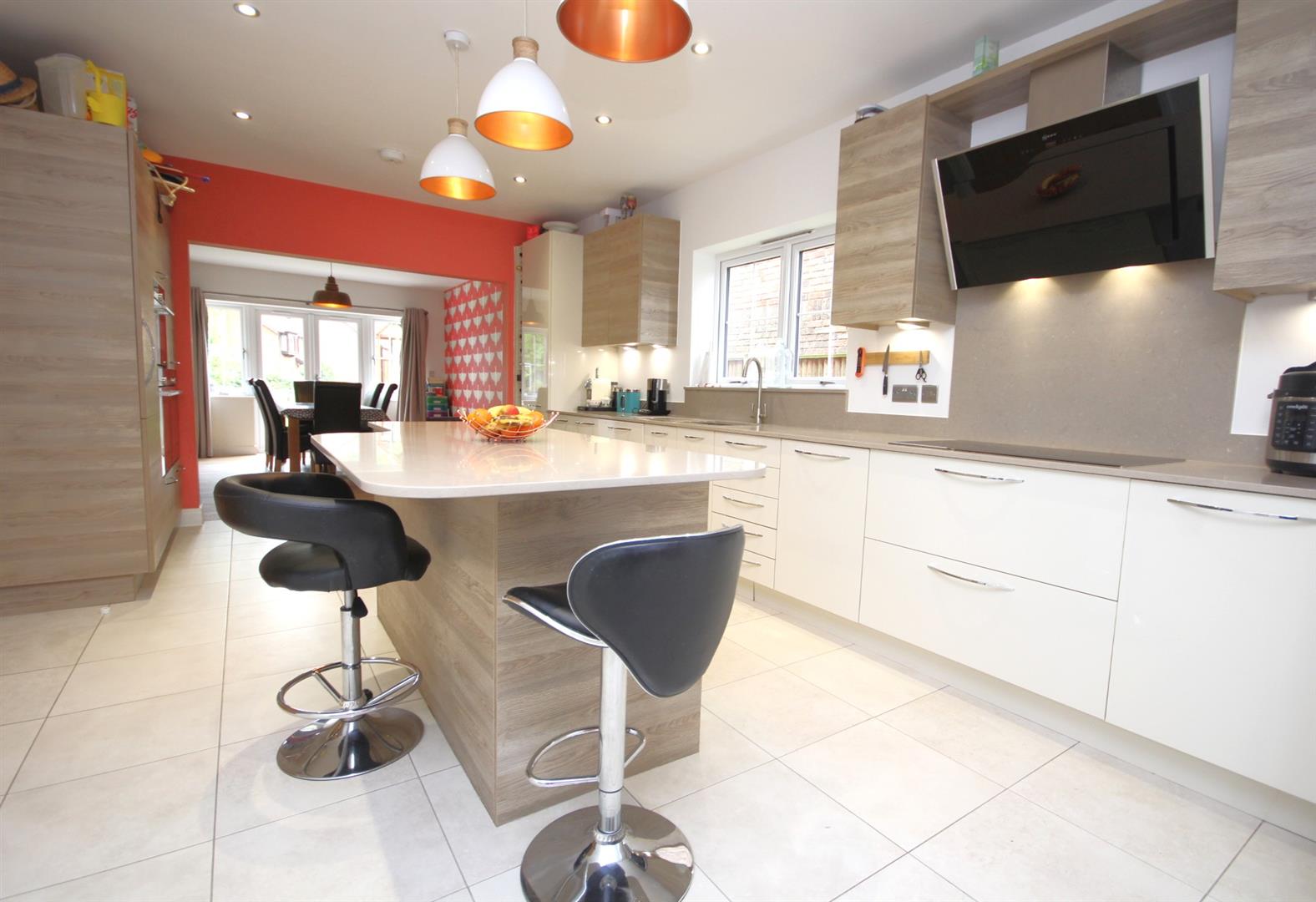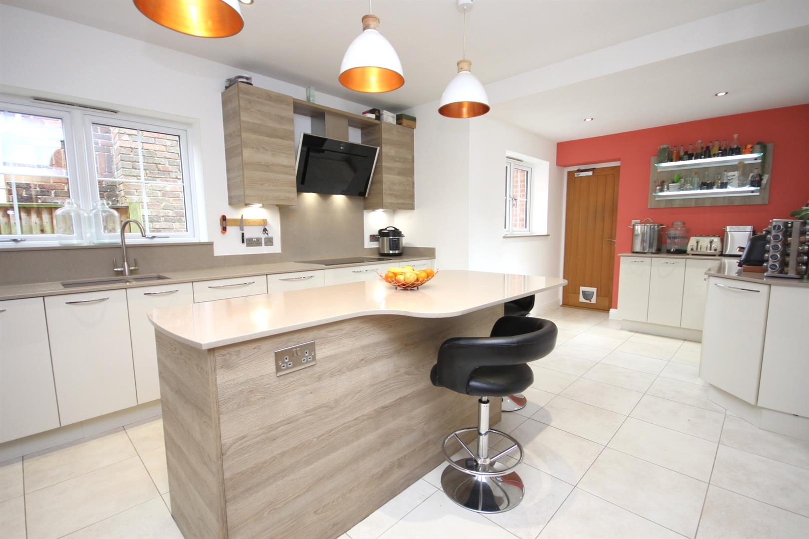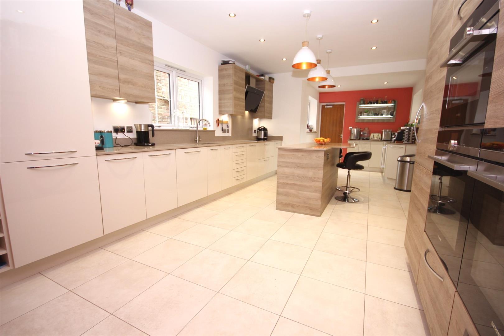 Impressively sized 24'10ft dual aspect kitchen/breakfast room enjoying two tone attractive wood effect and high gloss cabinets, granite worktops & central island