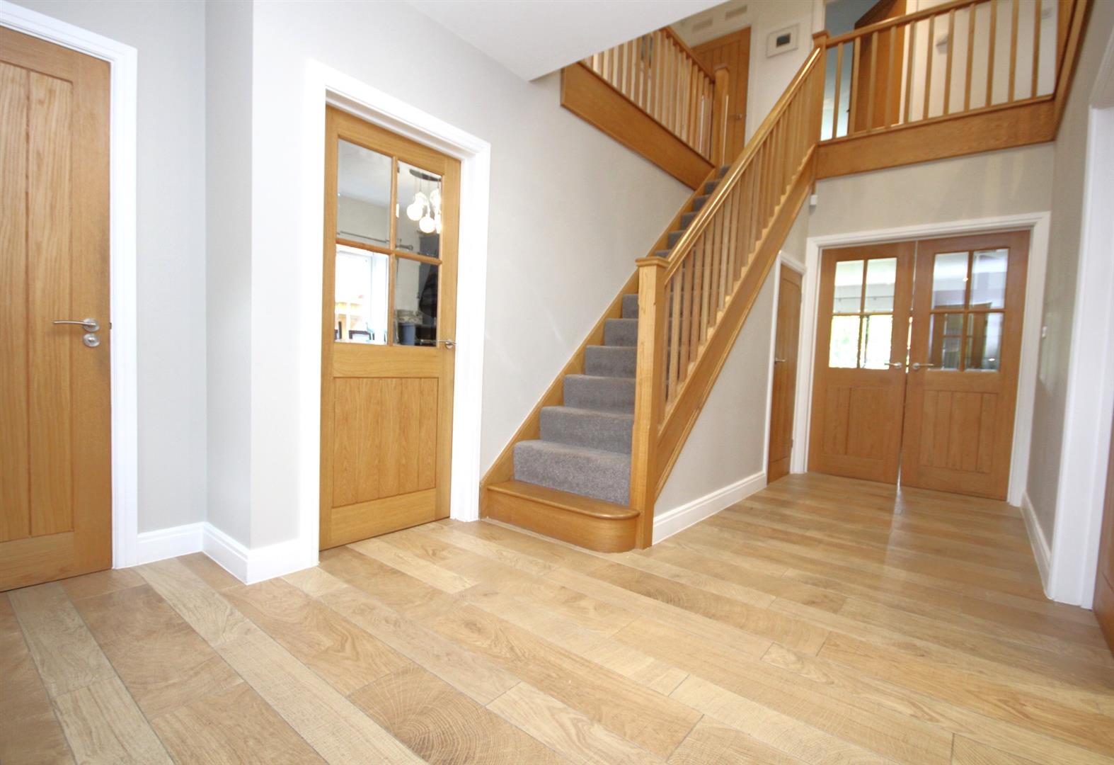 Welcoming entrance hall with feature Porcelanosa wood effect tiled flooring flowing into the lounge, dining room & family room