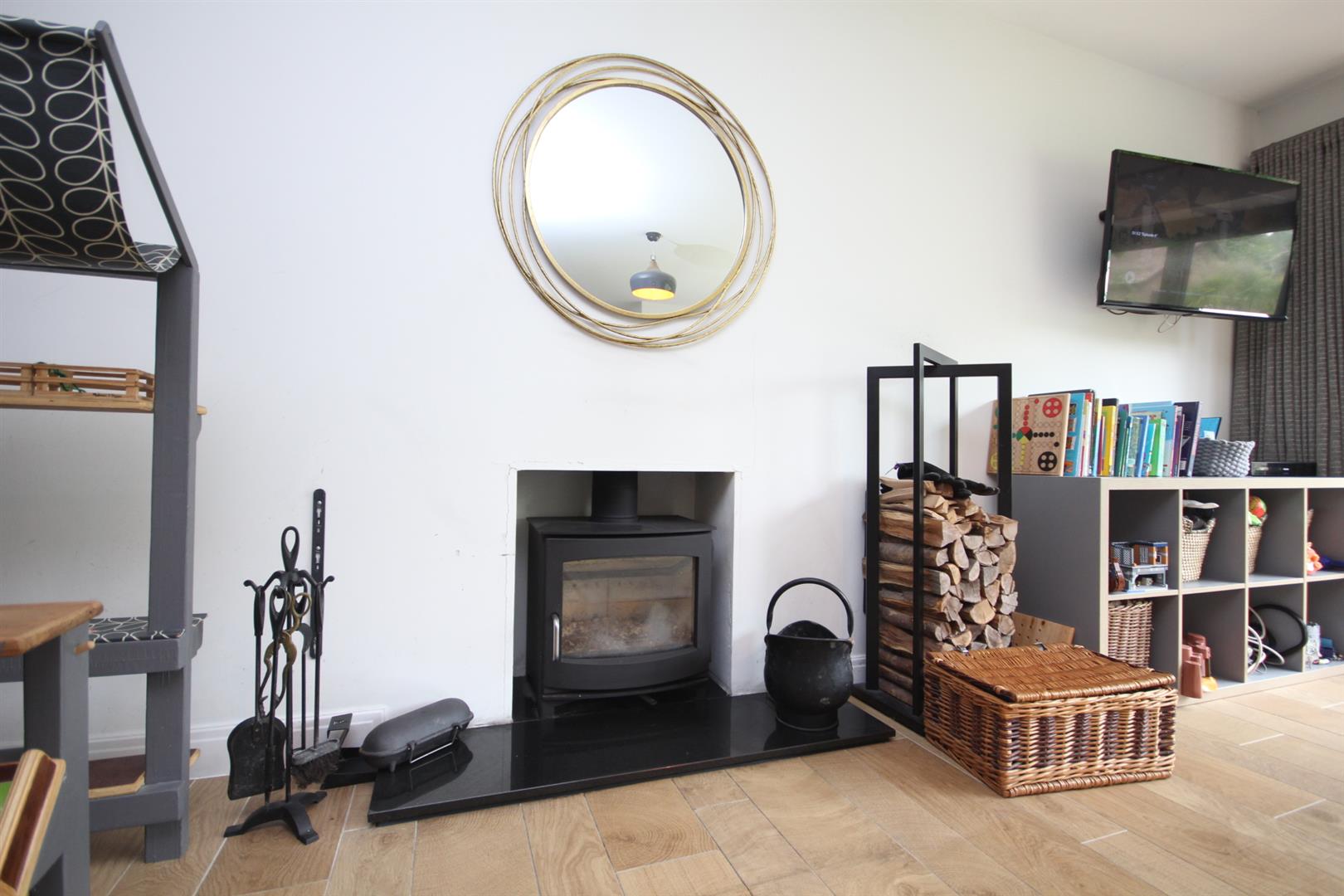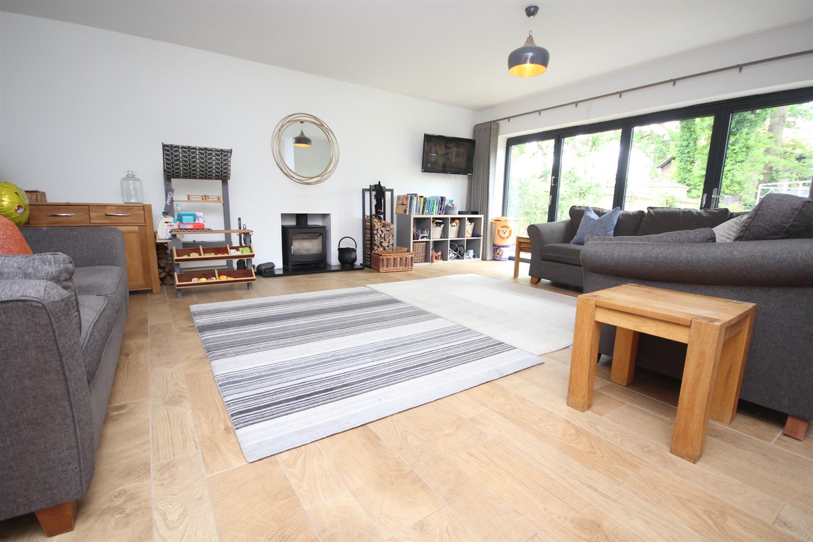 20'6ft Lounge enjoying bi-folding doors opening out onto the rear garden, feature centrepiece fireplace with inset log burner & internal oakwood double doors into the dining room