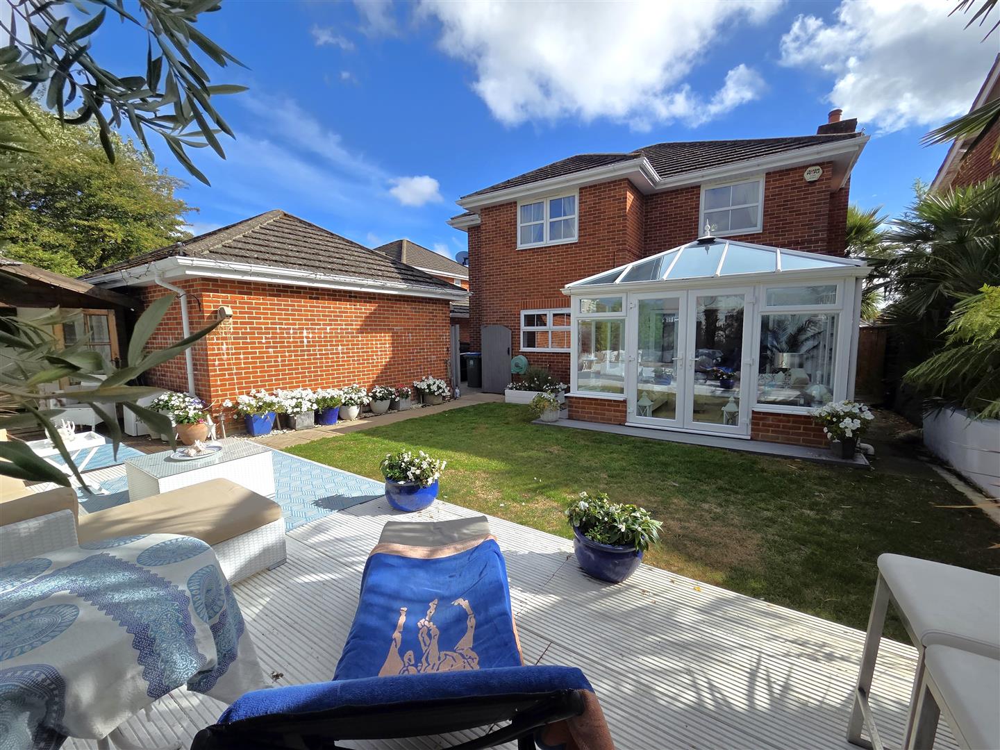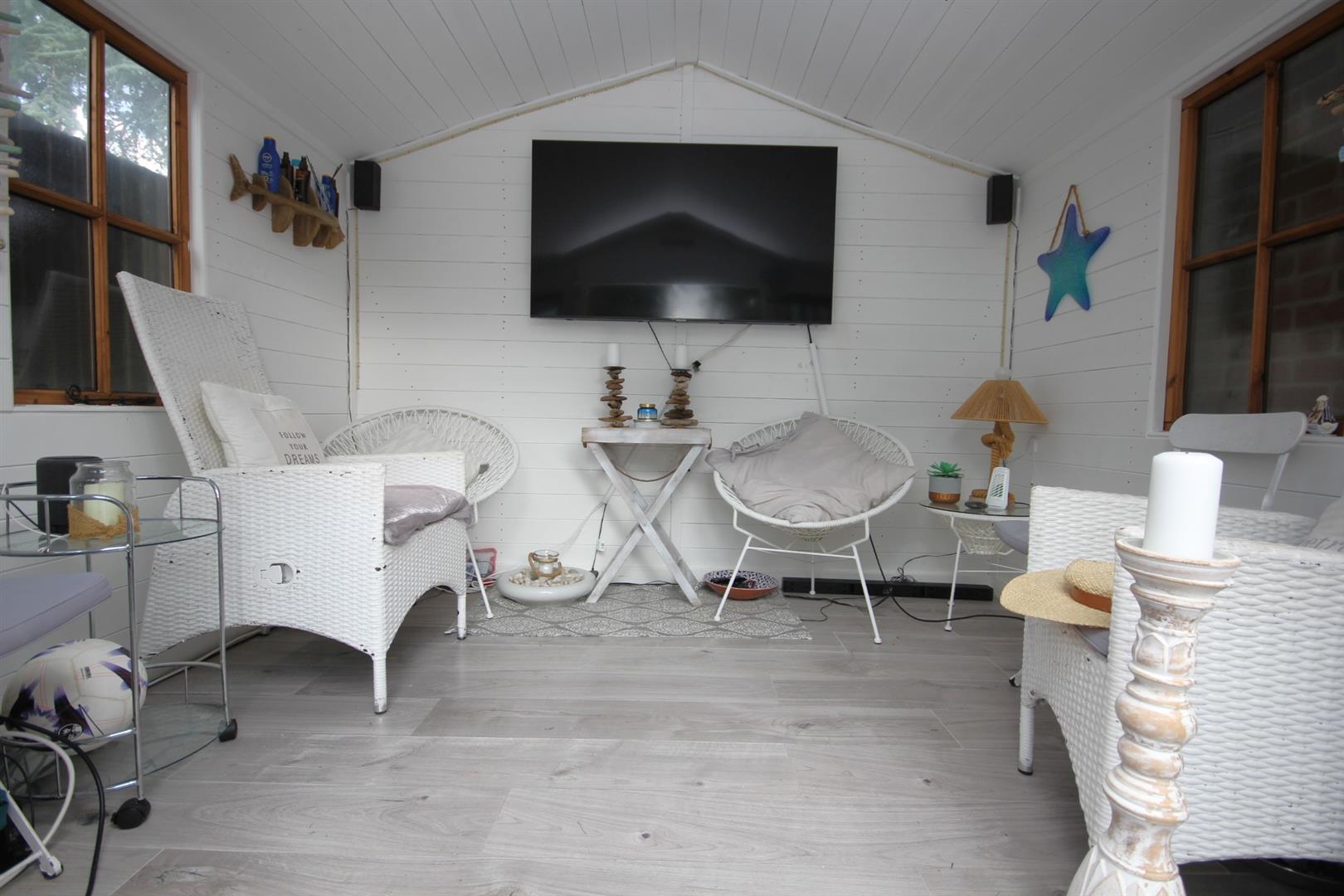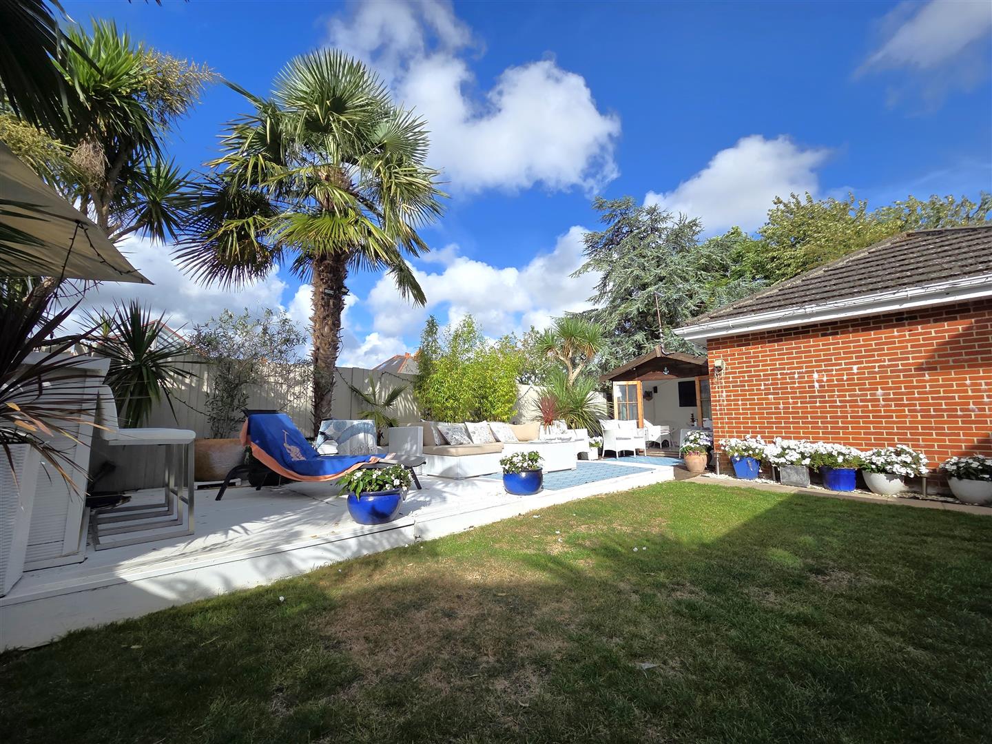Landscaped rear garden enjoying lawn area, raised decked sun terrace, paved patio with display flower/shrubbery & summer house to remain