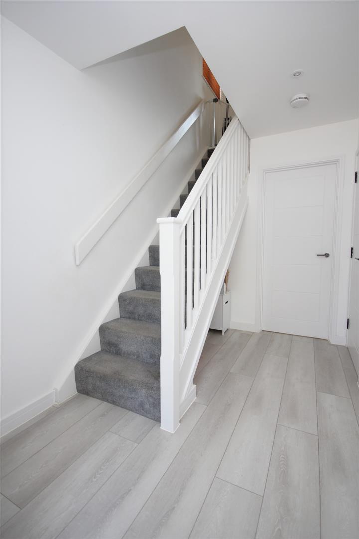 Welcoming entrance hall enjoying built in storage cupboard & attractive wood effect laminate flooring flowing into the kitchen/dining/family room & downstairs cloakroom