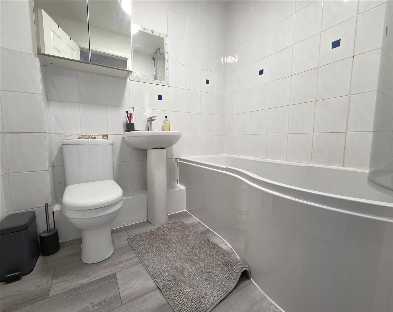 Main bathroom comprising three piece white suite & built in storage cupboard