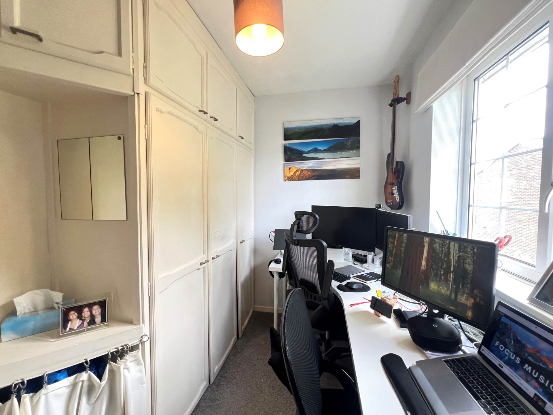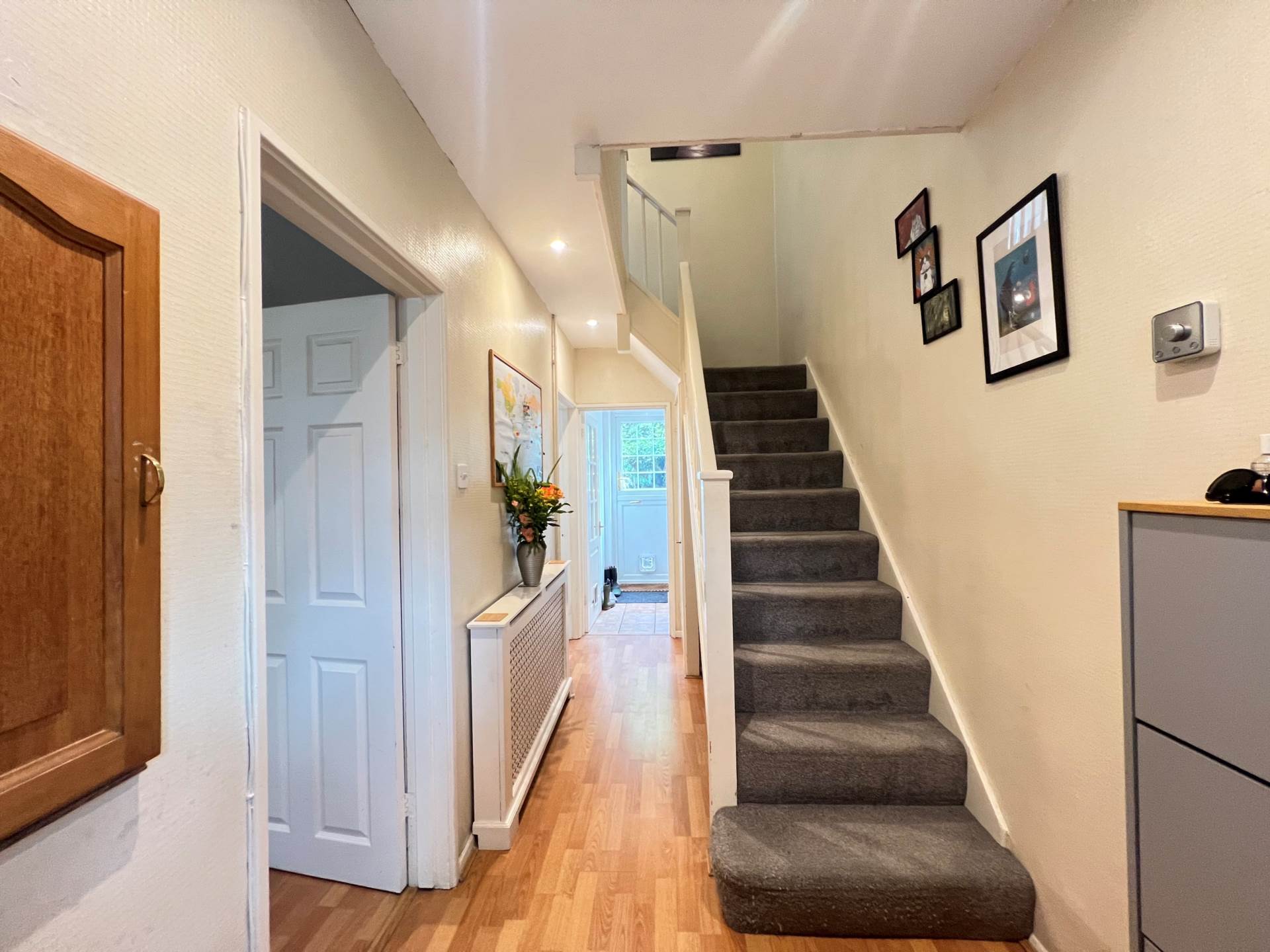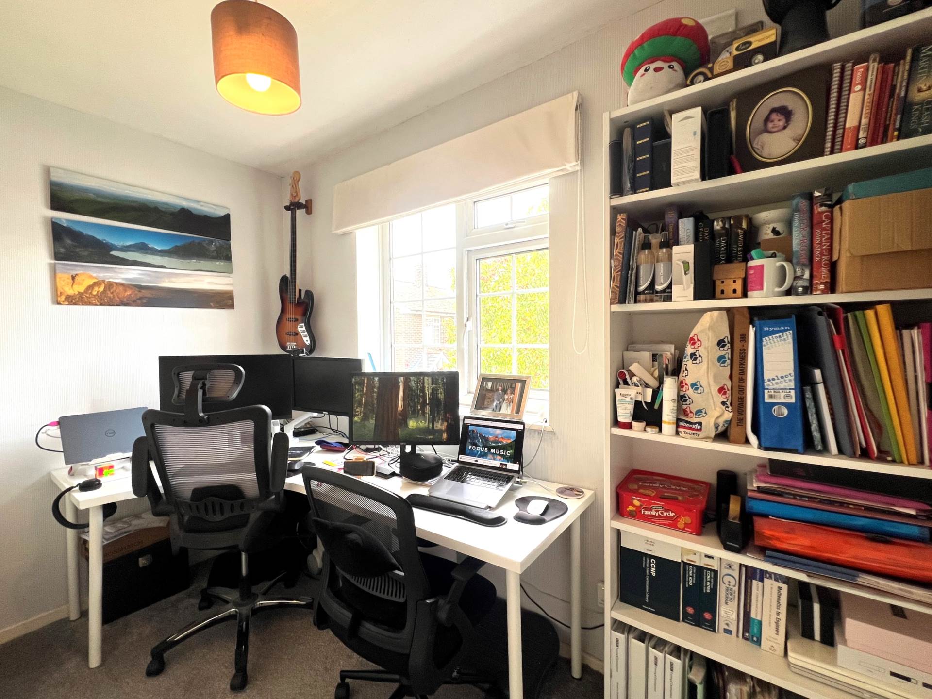 Upstairs there are three good sized Bedrooms with fitted wardrobes and a fully tiled family Bathroom. The main bedroom has been recently modernised to a high spec, with the third bedroom currently set up with space for two people to work from home.